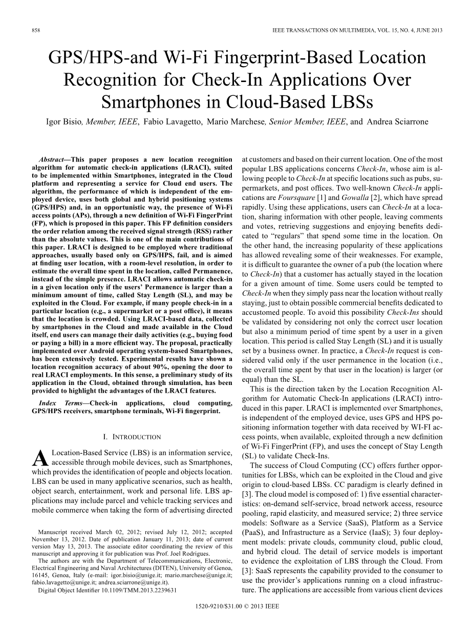 摘要:本文提出了一种新的位置识别自动签到应用算法(LRACI),适合于智能手机,集成在云平台和代表服务的云终端用户。本文提出,这个算法,其性能是独立于所采用的设备,使用全球和混合定位系统(GPS/HPS)的技术,以随机方式的Wi-Fi存在接入点(APS),通过Wi-Fi指纹的新定义(FP)的算法。这个FP定义考虑到接收信号强度(RSS)之间的顺序关系比绝对值。这是本文主要贡献之一。LRACI的设计是采用传统的方法,通常只基于GPS/HPS,失误,并努力找到用户的位置,与房间的水平分辨率,以估计在定位花费的全部时间,称为持久性,而不是简单的存在。LRACI允许自动签到在给定的位置,只有当用户的持久性大于最小的时间,称为停留长度(SL),才可能运用在云上。例如,如果许多人入住特定位置(例如,超市或邮局),它意味着地点拥挤。使用LRACI基础资料,收集通过智能手机在云和在云中提供的信息,最终用户可以管理他们的日常活动(例如,购买食物)或以更有效的方式支付帐单)。实际的建议基于Android操作系统的智能手机,已被广泛测试。实验结果表明位置识别精度约90%,打开了LRACI推广使用的大门。从这个意义上说,它在云计算中的应用的初步研究,通过仿真实验得到,已经让LRACI显现突出的优势特点。