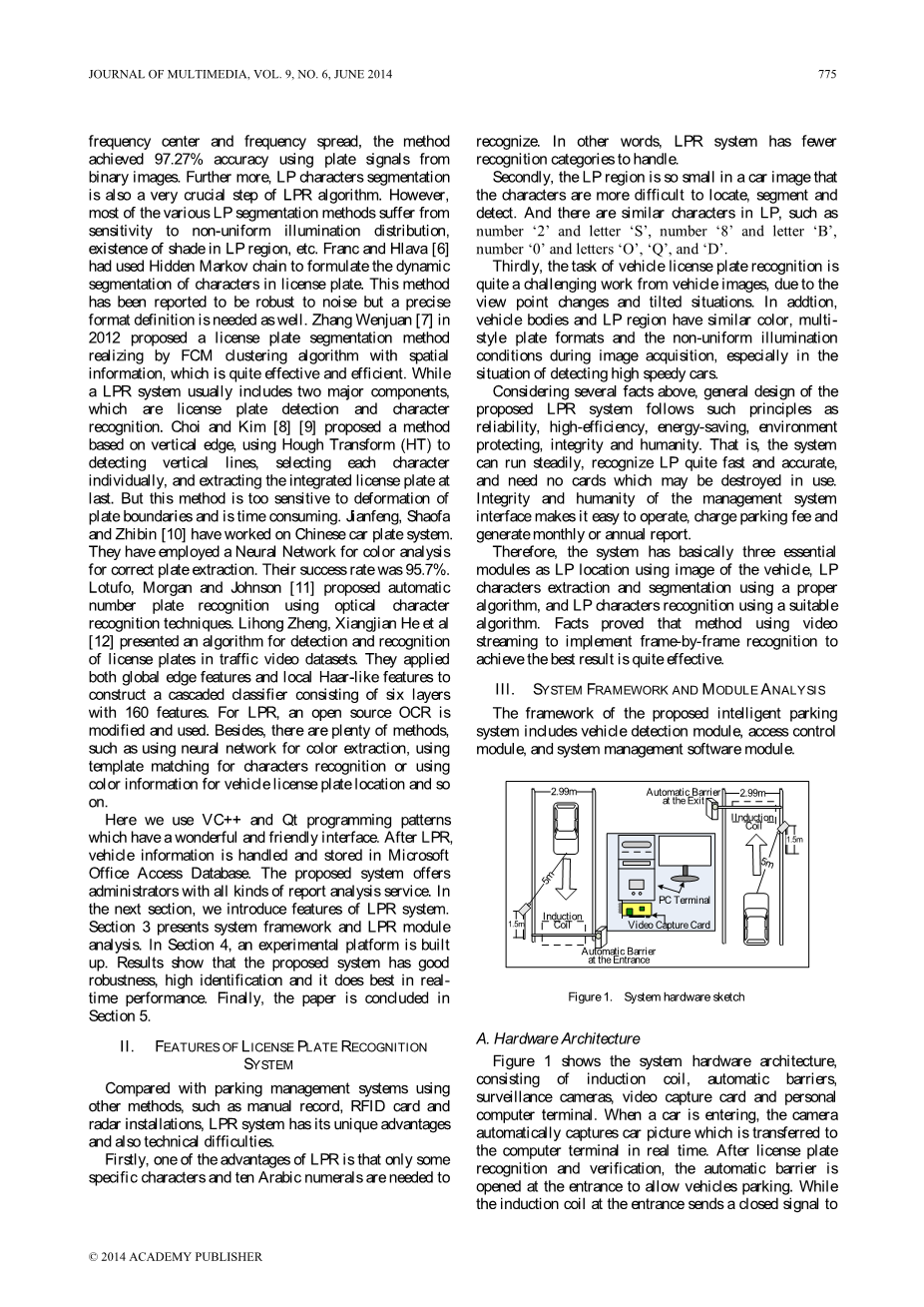 这里我们使用VC 和Qt编程模式,它有一个美好的,友好的界面。 LPR后,车辆信息的处理存储在Microsoft Office Access数据库中。所提出的系统为管理员提供各类分析报表服务。 在在下一部分中,我们介绍的车牌识别系统的性能。第3节介绍的系统框架和LPR模块分析。在第4节,一个实验平台建成。结果表明,该系统具有良好的鲁棒性,高识别性和实时性。最后,本文在总结第5节。