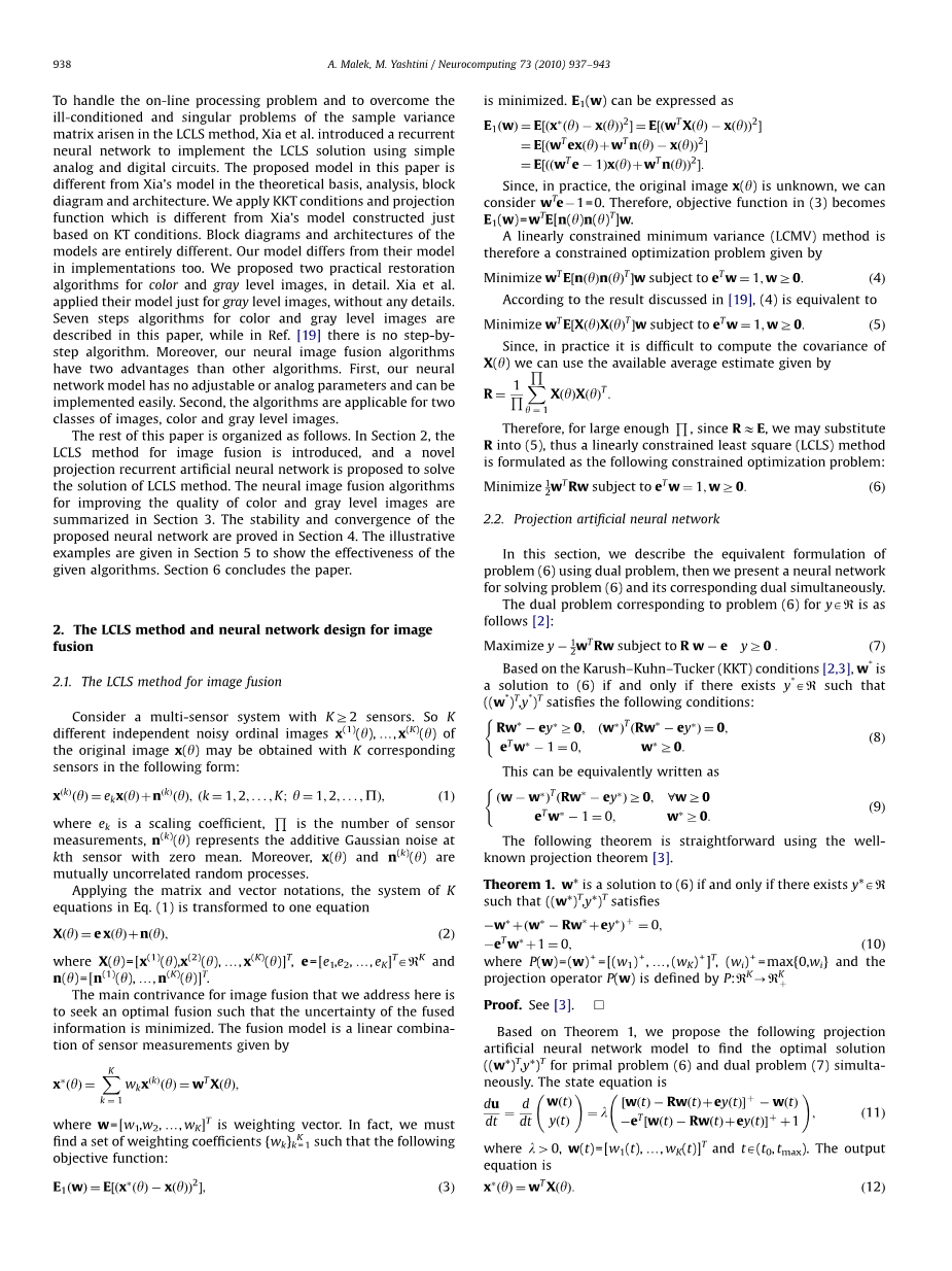 许多信号及融合的技术是基于统计方法的,例如近几年发展的最小方差估计法。尽管我们发现这些统计学融合方法很有效,然而他们全都要求被称为先验的传感信息的协变性。不幸的是,在一个多传感器系统中,协变性通常是不可行的。最小方差法的另一个问题是由于协变性矩阵的奇点而造成的数值不稳定。而且,其中一些统计融合方法对实时应用来说很难实现自适应,像信号和图像处理。针对统计学数据融合,夏和王提出了一种新颖的方法,叫线性约束最小二乘法(LCLS)。为了解决线上处理的问题和克服线性约束最小二乘法中样本方差矩阵产生的病态和非常态的问题。夏和他们的研究人员提出一种使用简单的模拟和数字电路递归神经网络方法来执行线性约束最小二乘法的解。本论文提出的模型不同于夏在理论基础、分析、屏蔽机制和体系结构中提出的模型。我们的模型应用了KKT最优化条件和投影函数,这区别于夏提出的仅基于KT条件的模型。屏蔽机制和模型的体系结构是完全不同的。在实现方面,我们的模型和他们的模型也有所区别。我们详细地介绍了适用于彩色和灰度级图像的两种实用的修复算法。夏和他们的研究人员提出的模型则只适用于灰度级图像,且并无细节。这篇文章针对彩色和灰度级图像的融合提出了七步算法,而在他们的文章中并没有一步一步的算法。此外,我们的神经网络图像融合算法比其他算法有两种优势。其一,我们的神经网络模型并没有可调整的或模拟的参数,所以能被简单地执行。其二,该算法适用于彩色和灰度级两种类型的图像。