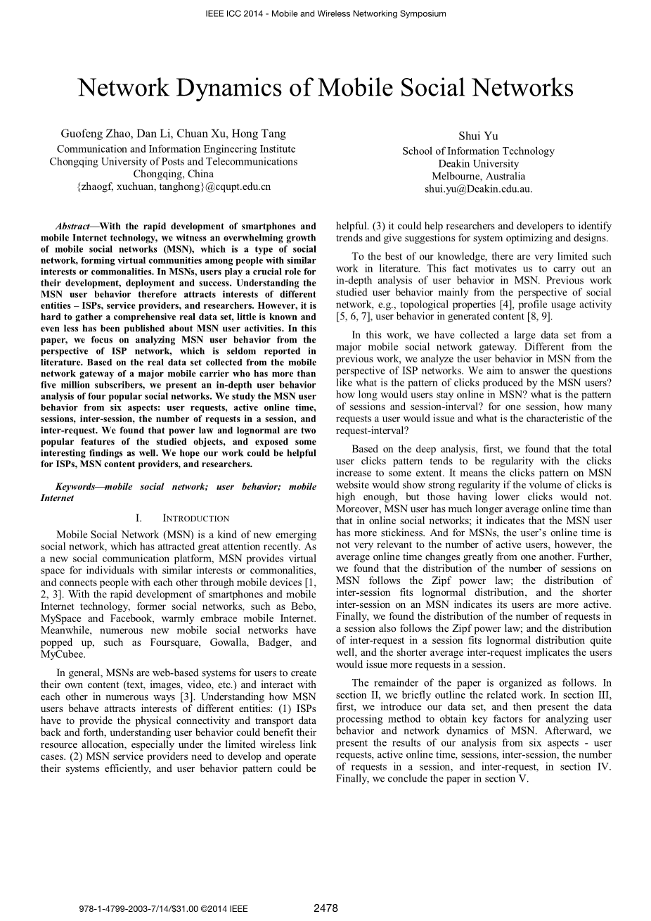 摘要:随着智能手机和移动互联网技术的飞速发展,移动社交网络(MSN)作为一种社交网络,在MSN中拥有相似或共性的虚拟社区,用户对其发展、部署和成功起着至关重要的作用。因此,了解MSN用户行为会吸引不同实体(ISP、服务提供商和研究人员)的兴趣。然而,收集一个全面的真实数据集是很困难的,人们对它知之甚少,而且关于MSN用户活动的研究也很少,本文从ISP网络的用户角度分析了MSN用户的行为。根据从一家拥有五百万用户的主要移动运营商的移动社交网关收集到的真实数据集,我们对四个流行的社交网络进行了深入的用户行为分析。我们从六个方面研究了用户行为:用户请求、活跃的在线时间、会话、会话间、会话中的请求数和请求数。我们发现幂律和对数正态是研究对象的两大特征,同时也暴露了一些有趣的发现。我们希望我们的工作能对互联网服务提供商、MSN内容提供商和研究人员有所帮助。