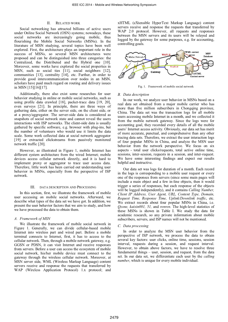 在这项工作中,我们从一个主要的移动社交网络网关收集了一个大数据集。与以往的工作不同,我们从ISP网络的角度分析了MSN中的用户行为。我们的目标是回答这样的问题:MSN用户的点击模式是什么?用户会在MSN中在线多久?会话和会话间隔的模式是什么?对于一个会话,用户将发出多少请求,请求间隔的特征是什么?