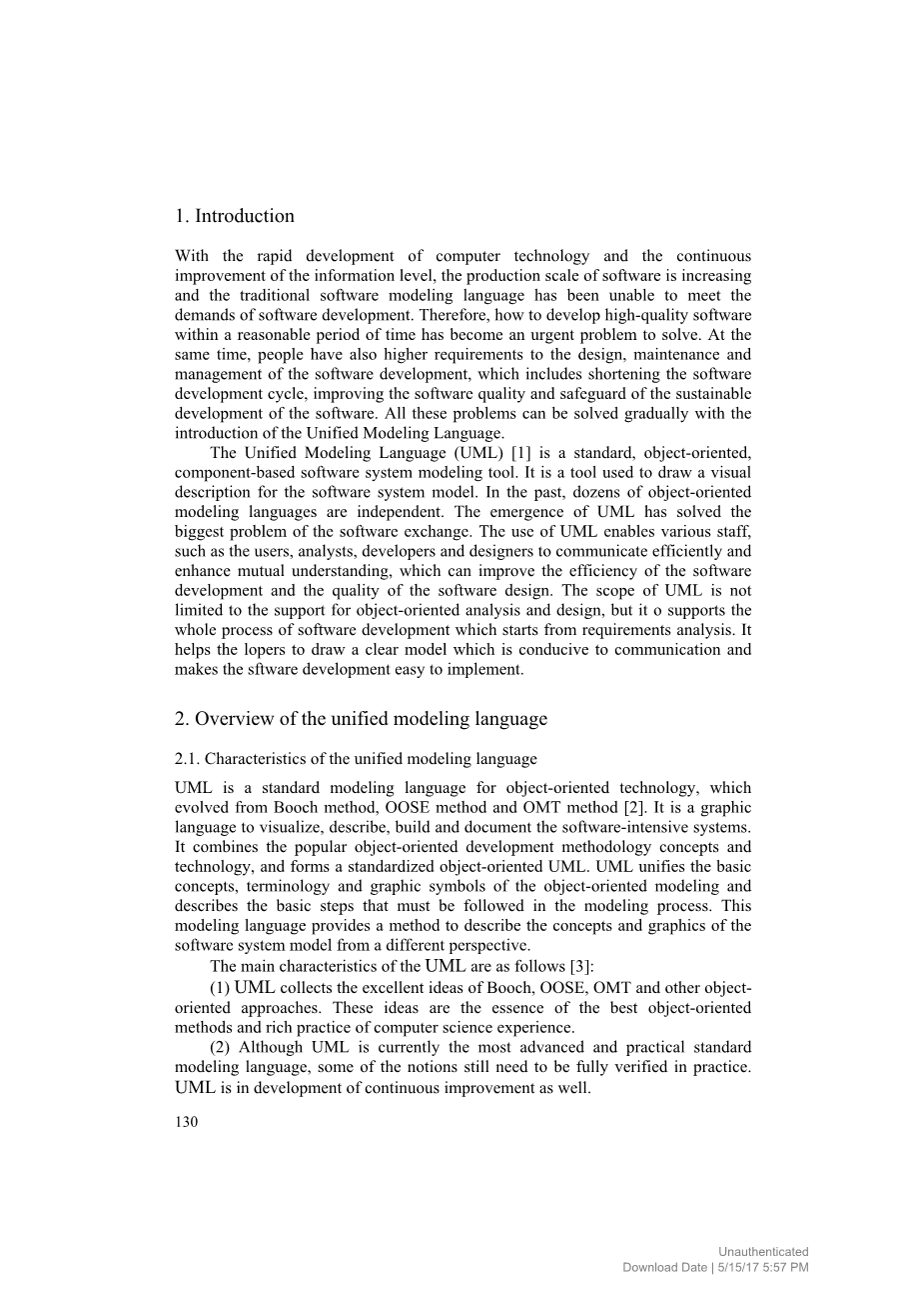 随着计算机技术的飞速发展和信息化水平的不断提高,软件的生产规模不断扩大,传统的软件建模语言已无法满足软件开发的需求。因此,如何在合理的时间内开发出高质量的软件已成为亟待解决的问题。同时,人们对软件开发的设计,维护和管理提出了更高的要求,包括缩短软件开发周期,提高软件质量,保障软件的可持续发展。所有这些问题都可以通过引入统一建模语言逐步解决。统一建模语言(UML)[1]是一种标准的,面向对象的,基于组件的软件系统建模工具。它是用于绘制软件系统模型的可视描述的工具。过去,许多面向对象的建模语言都是独立的。 UML的出现解决了软件交换的最大问题。 UML的使用使得诸如用户,分析员,开发人员和设计人员的各种工作人员能够有效地进行通信并增进相互理解,这可以提高软件开发的效率和软件设计的质量。 UML的范围不仅限于面向对象分析和设计的支持,它还支持从需求分析开始的整个软件开发过程。它有助于操作者绘制一个有利于沟通的清晰模型,使软件开发易于实现。