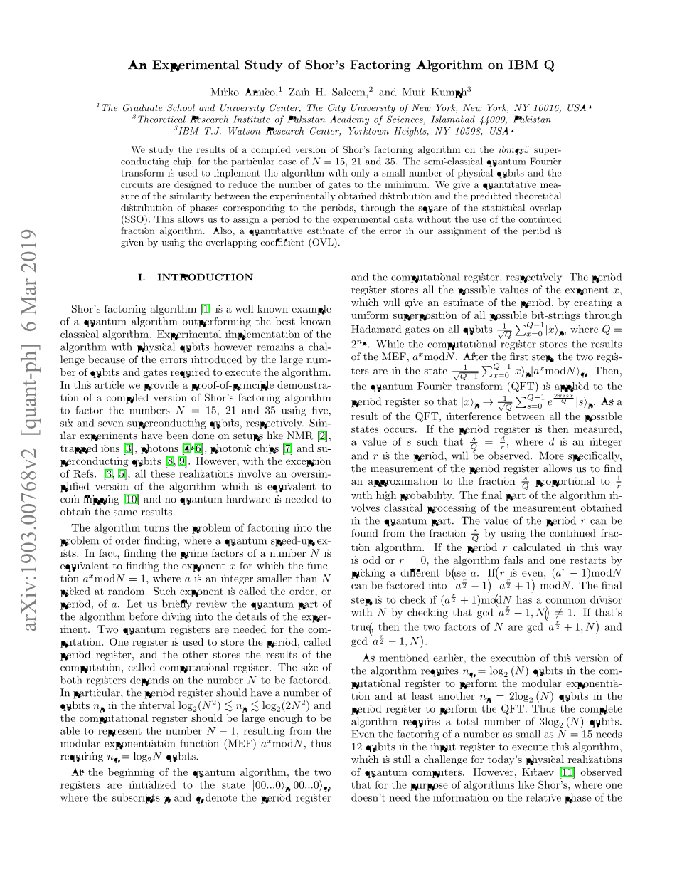 该文章按以下方式组织。秒。 II描述了用于实验的硬件。在第二节图3分别描述了N = 15,21和35的保理实验的实施。在ibmqx5量子处理器上运行算法得到的结果将在第二部分进行分析和讨论。 IV。结论如下。 V.