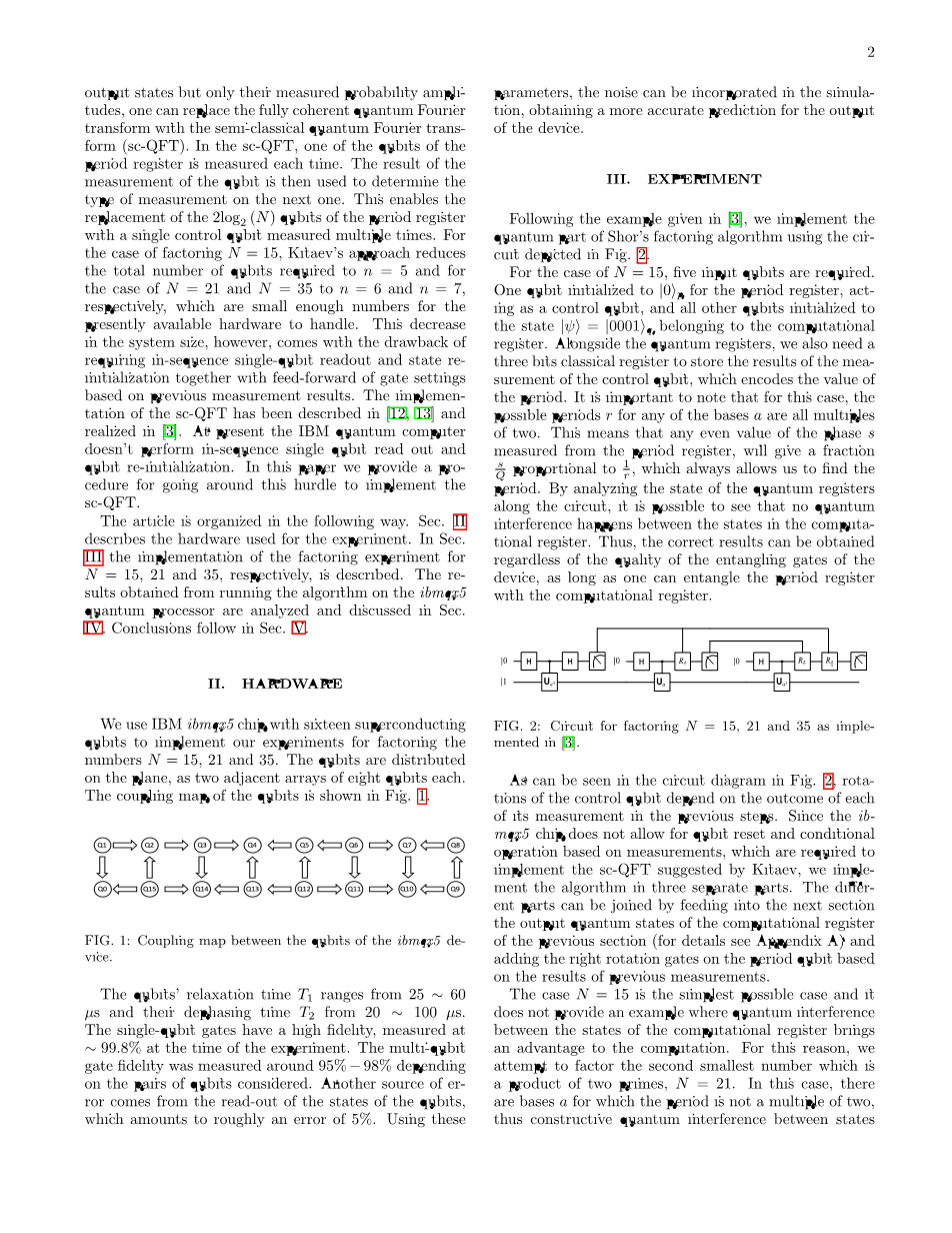 我们使用具有16个超导量子比特的IBM ibmqx5芯片来实现我们的实验,用于将数量N = 15,21和35分解。量子位分布在平面上,作为两个相邻的八个量子位的阵列。量子比特的耦合图如图1所示。