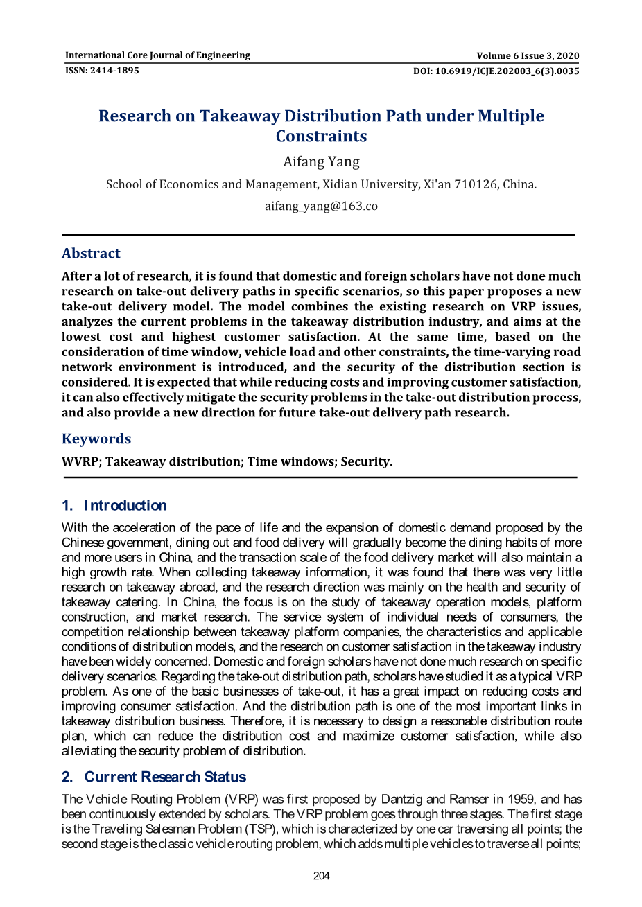 - Ping Chen, Hang Li. (2016).Research on Optimization of O2O Takeaway Distribution Path Based on Time Satisfaction [J]. Chinese Journal of Management Science, 24 (S1): 170-176.