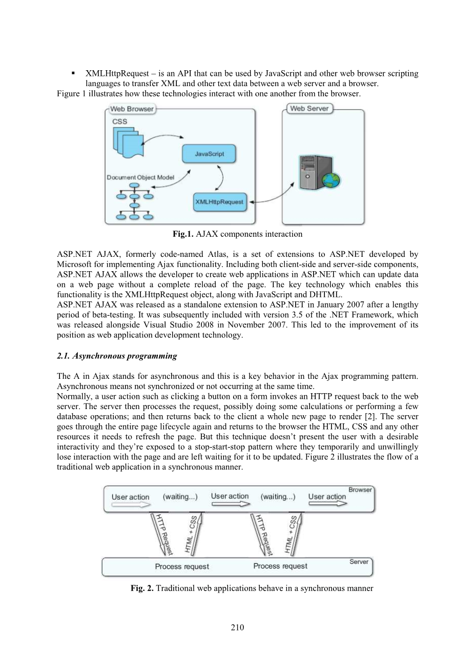 通常,用户操作(如单击表单上的按钮)会调用对web服务器的HTTP请求。然后服务器处理请求,可能做一些计算或执行一些数据库操作;然后返回给客户端一个全新的页面来渲染[2]。服务器将再次经历整个页面生命周期,并向浏览器返回刷新页面所需的HTML、CSS和任何其他资源。但是,这种技术并没有为用户提供理想的交互性,而是暴露在“停止-开始-停止”模式中,用户暂时且不情愿地失去与页面的交互,等待页面更新。图2以同步方式说明了传统web应用程序的流程。