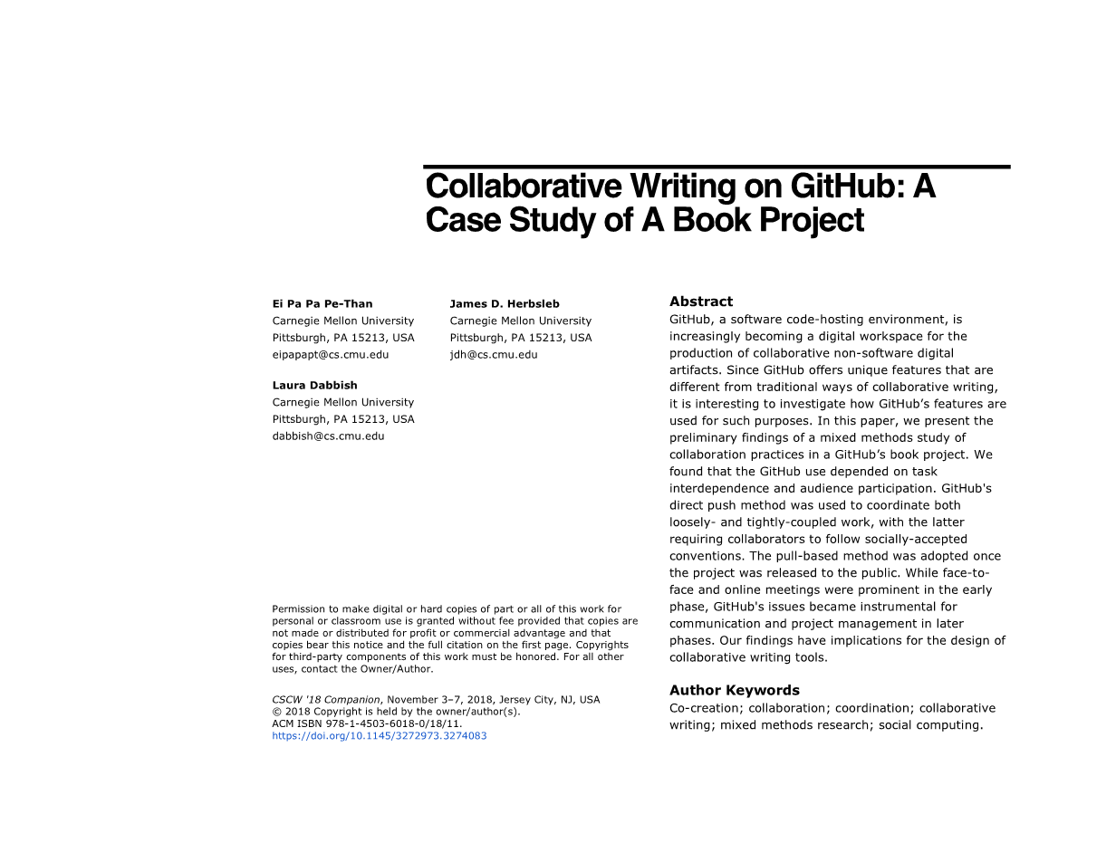 在本文中,我们介绍了在一个GitHub的图书项目中对协作实践进行一种混合方法的研究的初步发现。我们发现GitHub的使用取决于任务的相互依赖性和受众的参与。 GitHub的直接推送方法用于协调松散耦合和紧密耦合的工作,后者要求合作者遵循社会认可的惯例。该项目向公众发布后,便采用了基于拉动的方法。尽管面对面和在线会议在早期阶段很重要,但GitHub的问题追踪手段(issue)却在后期阶段成为交流和项目管理的主要方式。我们以上的发现将会对协作写作工具的设计产生影响。