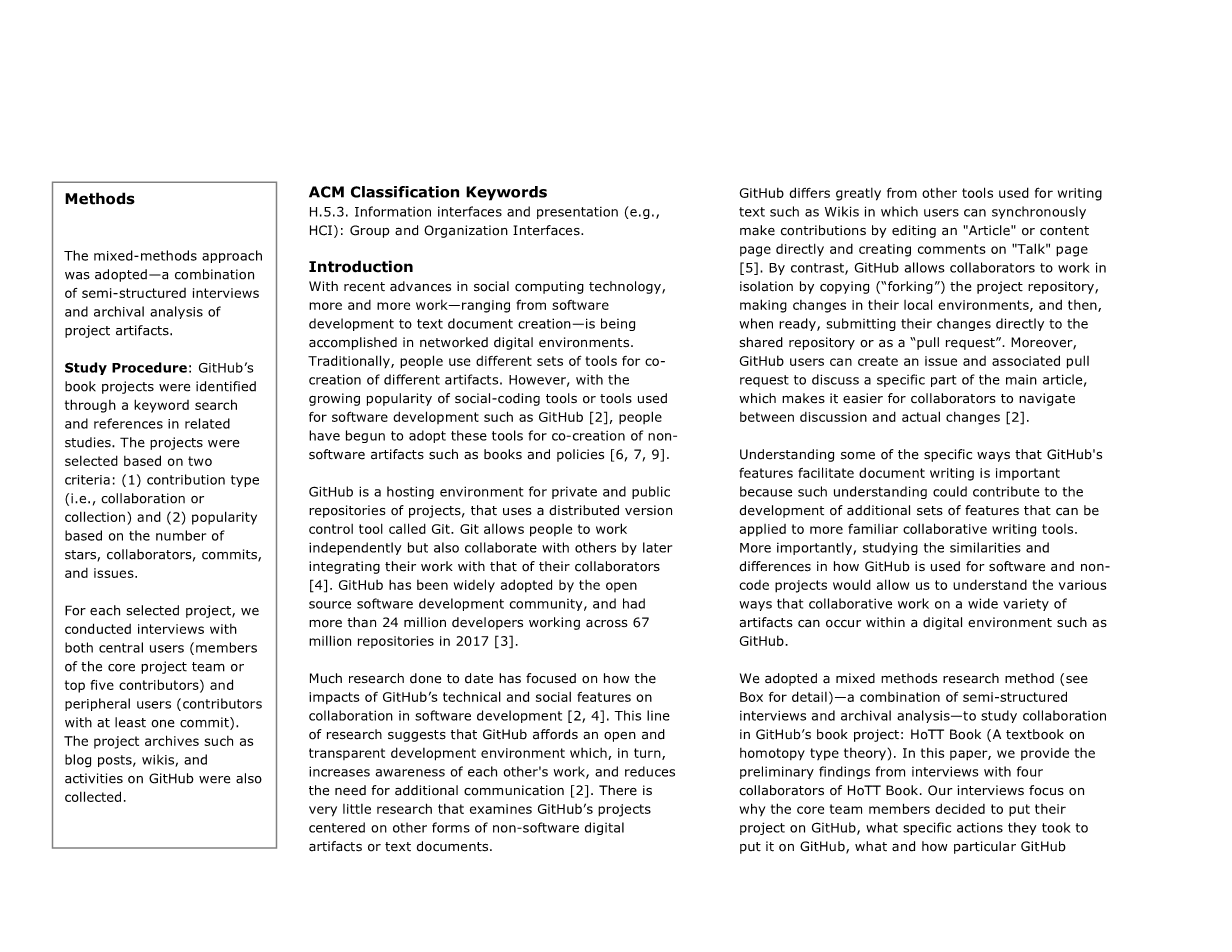 迄今为止,许多研究都只是集中在GitHub所采用的技术和所拥有的社交功能对软件开发中的协作的影响上[2,4]。这些研究表明,GitHub提供了一个开放透明的开发环境,从而提高了彼此的工作意识,并减少了额外交流的需求[2]。但是很少有研究以其他形式的非软件数字项目或文本文档为中心来检查GitHub的项目。