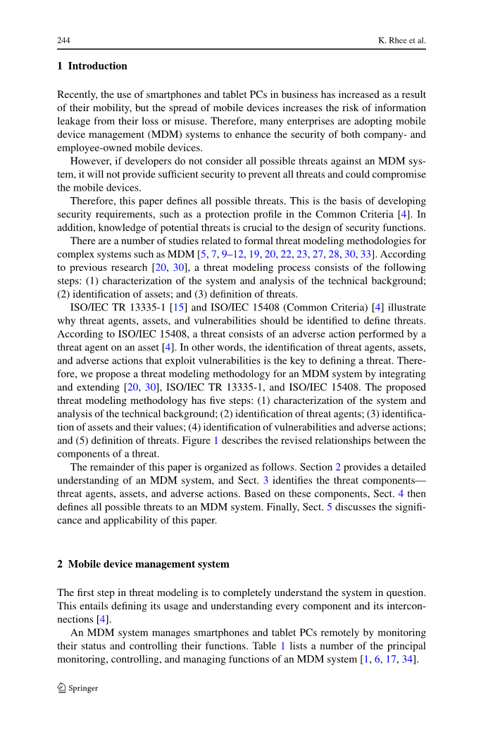 本文的其余部分组织如下:第二部分提供了关于 MDM 系统的详细说明,然后第三部分将对构成威胁的各个部分——攻击方、重要资源,以及非法行为进行识别。基于这些组成部分,文章的第四部分将定义所有 MDM 系统中可能的威胁。最后,第五部分将讨论本文的研究意义和普适性。