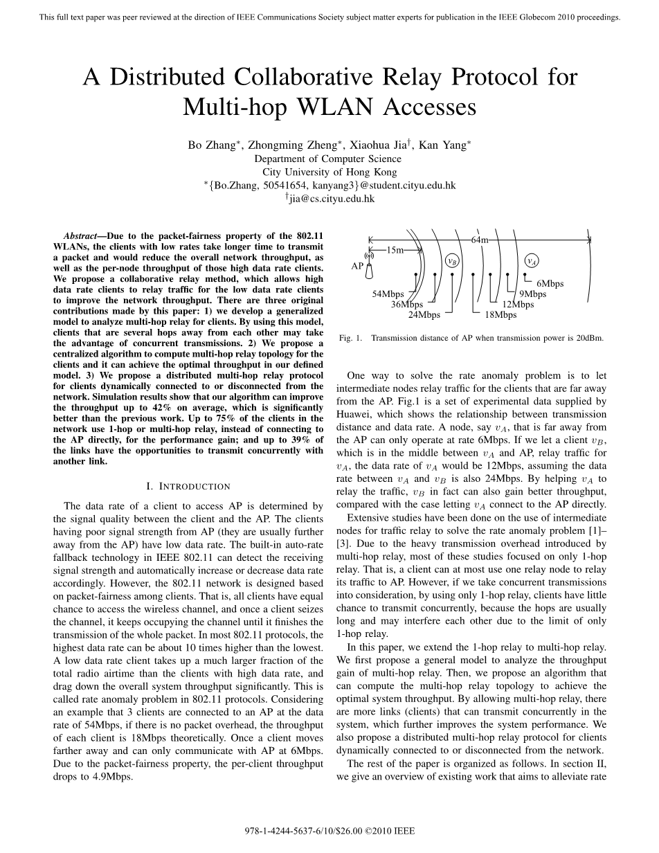 摘要——由于802.11 WLANs的数据包传输的公平性,低传输速率的客户端将耗费更长的时间完成数据包的传输,因此也降低了整个网络的吞吐量,这意味着其他高传输速率的客户端的吞吐量也会受到影响而降低。本论文提出了一种中继合作转发的方法,让高传输速率客户端为低传输速率的客户端中继转发数据从而提高网络的吞吐量。就此,本论文提出了三个原创的优化方法:1)我们建立了一个广义模型,用于分析客户端的多跳中继情况。此广义模型中,那些相隔节点较远的客户端可以利用并行传输的技术来提高网络吞吐量。2)我们提出了一个集中式算法,用以计算客户端的多跳中继拓扑情况,从而选择最优多跳中继方式来达到本广义模型可以达到的最大吞吐量。3)我们还为客户端提出了一个分布式多跳中继协议,来完成客户端对节点网络的动态接入和断开。仿真测试的结果表明,我们所提出的集中式算法显著提升网络性能,平均下来可以把吞吐量提高42%。在网络中,有高达75%的客户端使用单条中继或多跳中继的接入方式,而非与无线接入点直接连接,这有助于提高网络系统的性能。另外,网络中有高达39%的链接有机会与其他链接一起并发传输。