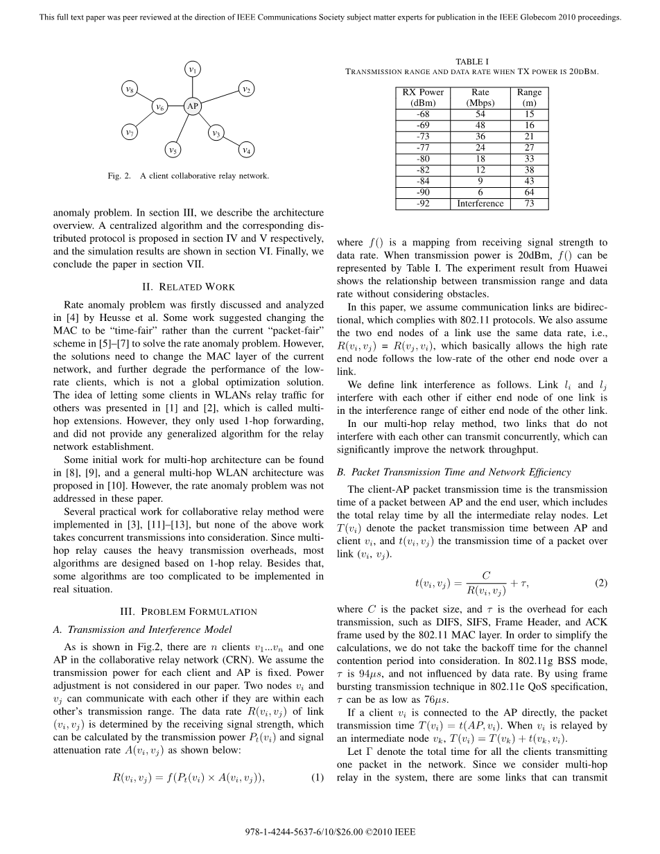 传输速率的异常问题最先是在Heusse等人的研究[4]中被提出讨论并分析的。有些研究建议将现在[5]–[7]中MAC所使用的数据包公平传输策略改变为时序公平传输策略,从而解决当前传输速率异常问题。然而,这种方法需要我们修改当前网络结构的MAC层属性,这其实会进一步降低低传输速率的客户端的性能,所以并非是一个整体最优化的解决方法。在[1]和[2]中提到了使用WLANs中一些客户端来完成中继转发的工作,这也被称为多跳拓展。然而,这些中继转发仅仅适用于单跳的情况,而并没有为中继转发网络提供出一个适用的推广算法。