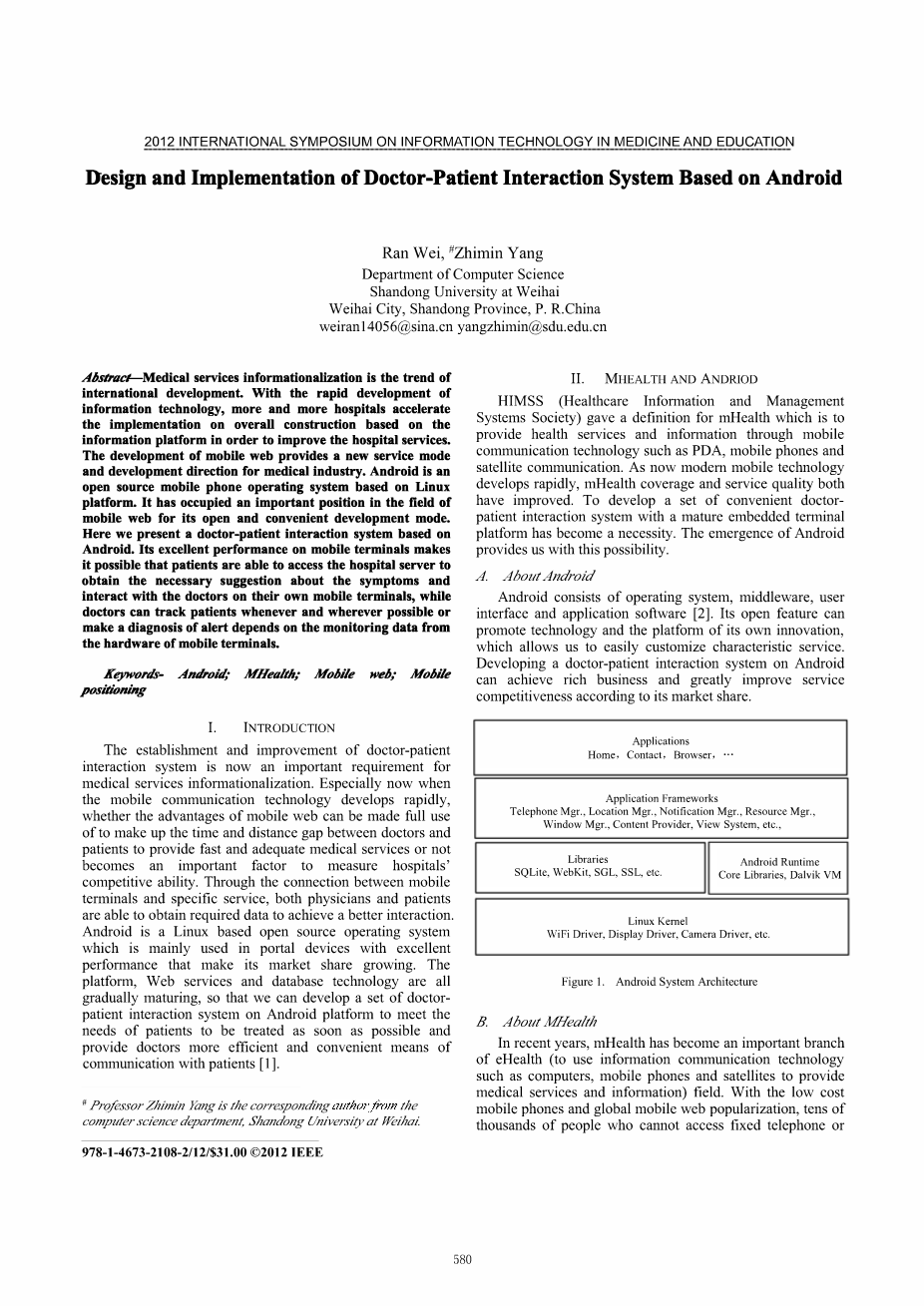 医疗服务信息化是国际发展的趋势。随着信息技术的快速发展,越来越多的医院正在加速实施基于整个医院的信息平台,以改善医院服务。而移动网络的发展又为他们提供了新的服务模式和医药工业的发展方向。Android是一个基于Linux的开源手机操作系统平台。它以其开放方便的开发模式在移动互联网领域占据了重要地位。在此我们提出一个以Android为基础的医患互动系统。其在移动终端上的出色性能使得患者能够访问医院服务器从而获得有关症状的必要建议,实现了与医生在自己的移动终端上的交互,而医生可以随时跟踪患者,或者尽可能地跟踪患者,并根据从移动终端上获取的监视数据做出紧急诊断。