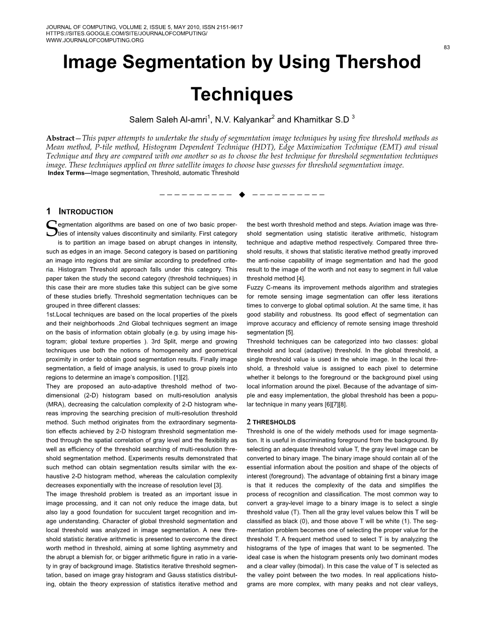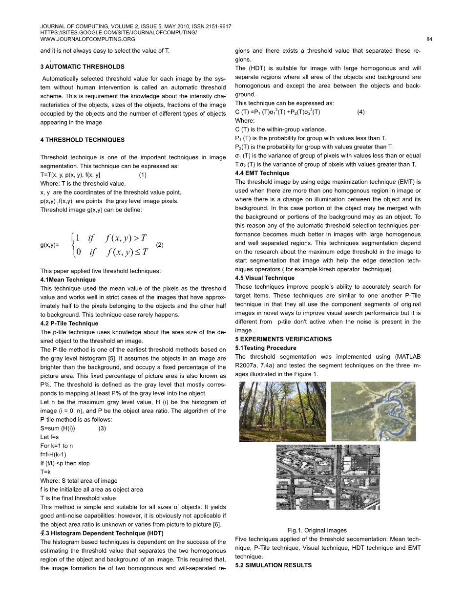 在本文中,通过比较适用于不同图像并研究了5种阈值分割技术的图像方法:平均法,P-tile法,直方图相关技术(HDT),边缘最大化技术(EMT)和视觉技术体现在如图所示的三个卫星图像上。图1.解释与实验证实针对进行了不同的技术的HDT和EMT技术分别是用于阈值的技术的图像的技术中是最好的技术。这个结果从图1,2,3的图像效果中得到。