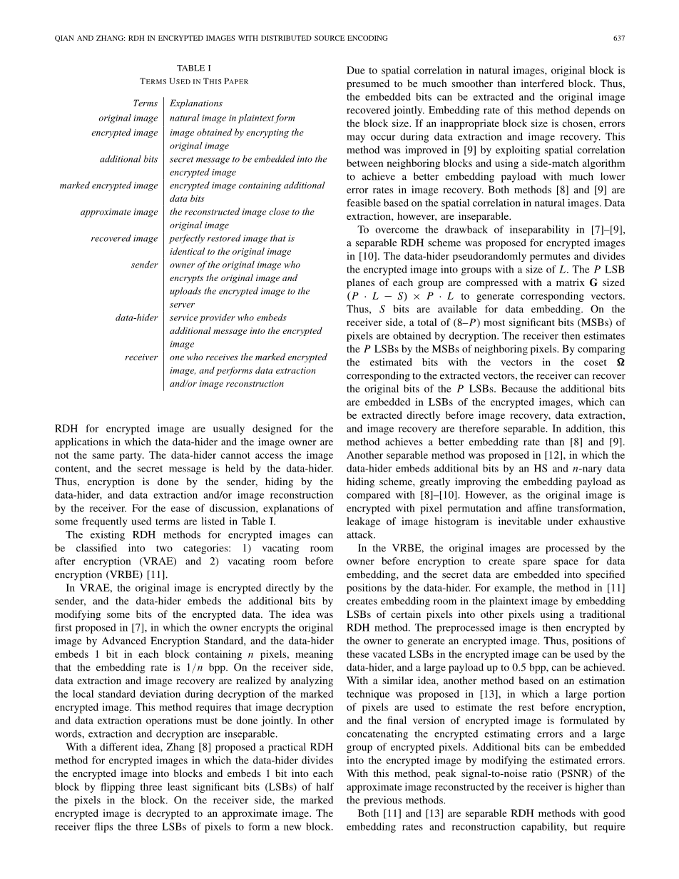 Zhang [8]提出了一种不同的实用的加密图像中的RDH方法,其中数据隐藏方将加密图像划分为块,并通过翻转块中一半的像素的三个最低有效位(LSBs)在每个块中嵌入一位。在接收方,标记的加密图像被解密为近似图像。接收方翻转像素的三个LSB形成一个新的块。由于在自然图像中的空间相关性,原始块被假定为比被干涉块更平滑。这样嵌入的比特就可以被提取出来,并且共同恢复原始图像。这种方法的嵌入率取决于块大小。如果选择了不适当的块大小,在数据提取和图像恢复期间可能会发生错误。在[9]中改进了该方法,通过利用相邻块之间的空间相关性和使用边匹配算法在图像恢复中获得了更高的有效嵌入载荷和更低的错误率。基于自然图像的空间相关性,两种方法[8][9]都是可行的。然而数据提取是不可分离的。