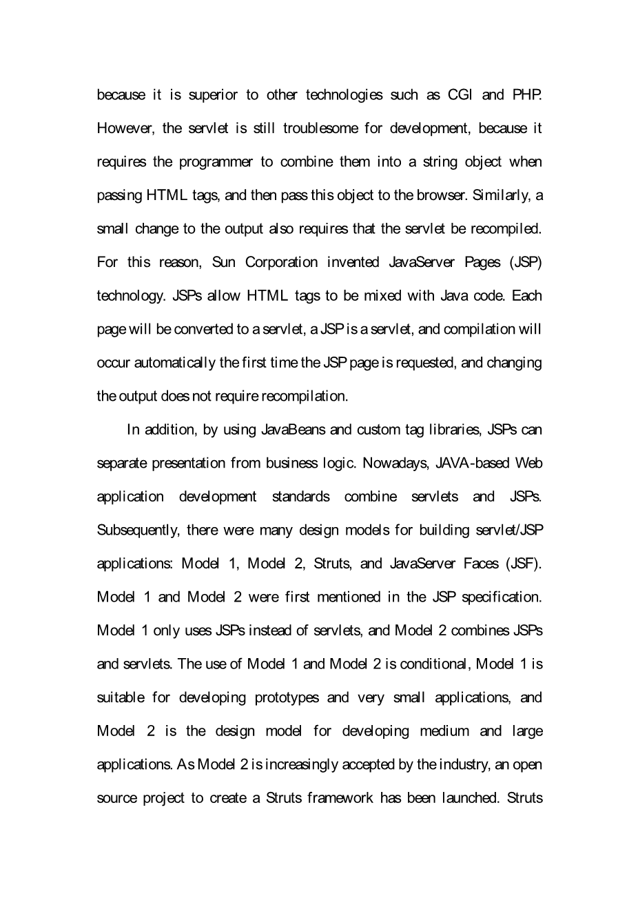 另外,通过使用 JavaBean 和定制标签库, JSP 能够将表示与业务逻辑相分离。 现 今,基于 JAVA 的 Web 应用开发标准是将 servlets 与 JSP 结合在一起。随后,出现了许多 种设计模型用来构建 servlet/JSP应用:Model 1、 Model 2、 Struts]和 JavaServer Faces (JSF )。 Model 1和 Model 2最早是在 JSP 规范中被提及的。 Model 1只使用 JSP 而不使 用 servlet , Model 2则结合了 JSP 与 servlet 。 Model 1和 Model 2的使用是有条件的, Model 1适合与开发原型和非常小的应用, Model 2则是开发中型和大型应用推荐的设 计模型。由于 Model 2越来越被行业所接受,一个建立 Struts 框架的开源项目也因此 被启动了。 Struts 通过为 Model 2提供了模型-视图-控制器中的控制器来完善 Model 2。另外, Struts 提供了更好的页面导航管理机制和一些定制标签库,能够进行更快 速的开发。尽管它学习难度大,并且,实际上它没有在任何的规范中被定义,但是它 还是作为 Model 2的一种替代获得了流行。 JavaServer Faces是在 JCP 的 JSR-127规范 下被建立。 Sun 公司力推这项技术,希望它能够成为构建 Java Web应用的最终模型。 JSF 最重要的特性是对 ready-to-use 组件的支持,比如:可扩展用户接口组件、简易 的页面导航、输入验证、数据转换和 JavaBean 管理机制。 servlet/JSP程序员面临的 问题是选择最合适的设计模型。明显的, JSF 在开发时间上提供了更好的解决方案。 然而,有些人担心实施 JSF 的开销所带来的性能下降而不愿采用这种技术。