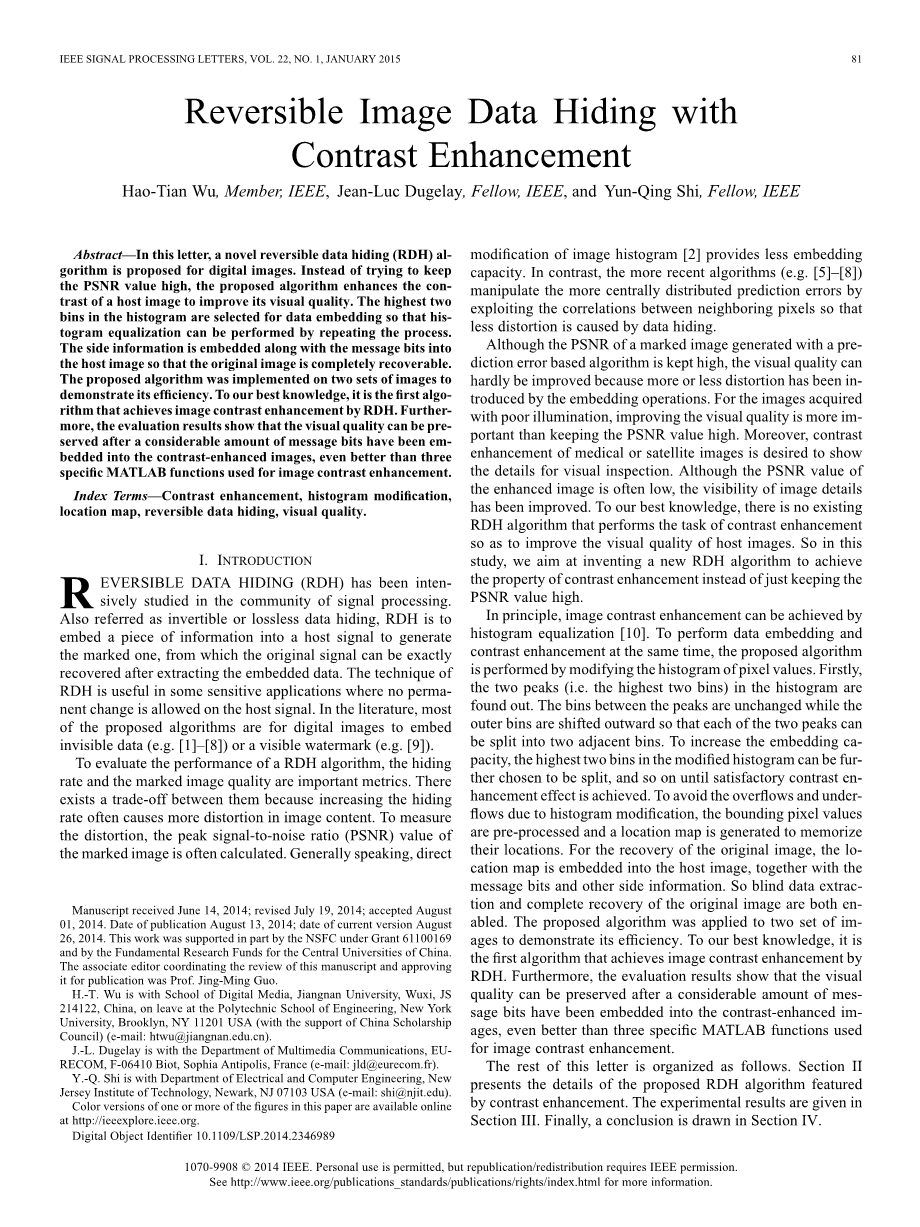 关键词 - 对比度增强,直方图修改,位置图,可逆数据隐藏,视觉质量