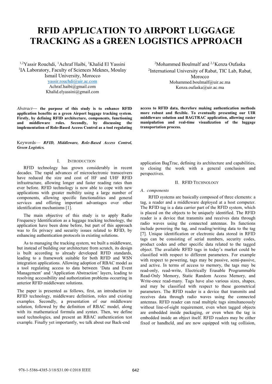 摘要: 本研究的目的是增强RFID作为绿色机场行李跟踪系统的应用优势。首先,通过定义RFID架构,组件,功能和中间件角色。 其次,通过讨论实施基于角色的访问控制作为一种工具调节访问RFID数据,从而制定身份验证方法更强大,更灵活。 最终呈现我们的UIR中间件解决方案和BAGTRAC应用程序,让行李箱的操纵更轻松和实时可视化运输过程。