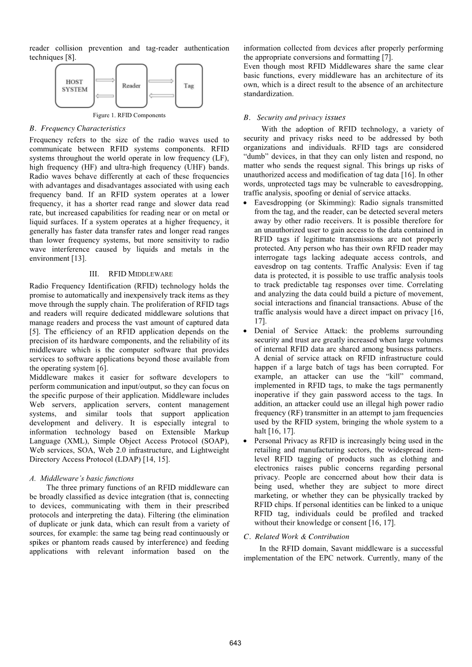 射频识别(RFID)技术拥有承诺自动,低成本地跟踪项目通过供应链。 RFID标签的激增读者需要专门的中间件解决方案管理读者并处理大量捕获的数据[5]。 RFID应用的效率取决于其硬件组件的精度和可靠性中间件,它是提供的计算机软件应用程序以外的服务操作系统[6]。中间件使软件开发人员更容易执行通信和输入/输出,以便他们可以专注于他们申请的具体目的。中间件包括Web服务器,应用程序服务器,内容管理系统和支持应用程序的类似工具开发和交付。它尤为重要基于可扩展标记的信息技术语言(XML),简单对象访问协议(SOAP),Web服务,SOA,Web 2.0基础结构和轻量级目录访问协议(LDAP)[14,15]。