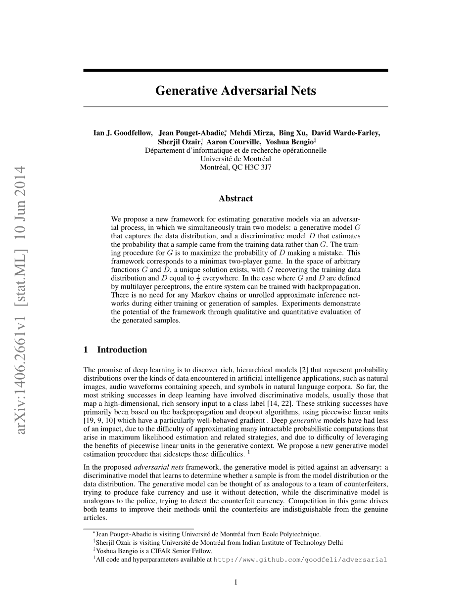我们提出了一种新的生成模型估计程序,可以避免这些困难。在提出的对抗性网络框架中,生成模型与对手进行对比:一种判别模型,用于确定样本是来自模型分布还是数据分布。生成模型可以被认为类似于造假者团队,试图生产虚假货币并在没有检测的情况下使用它,而歧视模型类似于警察,试图检测伪造货币。在这个游戏中的竞争促使两个团队改进他们的方法,直到假冒伪劣品与真品无法区分。该框架可以为多种模型和优化算法提供特定的训练算法。在本文中,我们探讨了生成模型通过多层感知器传递随机噪声生成样本的特殊情况,并且判别模型也是多层感知器。我们将这种特殊情况称为对抗性网络。在这种情况下,我们可以仅使用非常成功的反向传播和丢失算法来训练两个模型,并且仅使用前向传播来生成来自生成模型的样本。不需要近似推理或马尔可夫链。