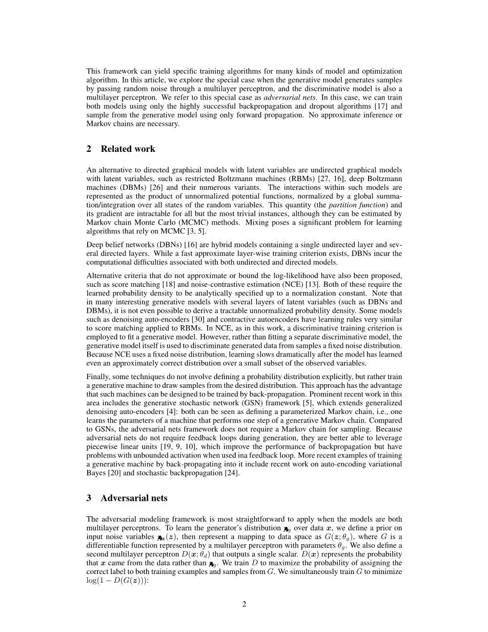 具有潜在变量的定向图形模型的替代方案是具有潜在变量的无向图形模型,例如受限制的玻尔兹曼机器(RBM),深玻尔兹曼机器及其众多变体。这些模型中的相互作用表示为非标准化势函数的乘积,通过随机变量的所有状态的全局求和/积分来归一化。这个数量(分区函数)及其梯度对于除了最平凡的实例之外的所有实例都是难以处理的,尽管它们可以通过马尔可夫链蒙特卡罗(MCMC)方法来估计。混合对于依赖MCMC的学习算法提出了一个重要问题。深度置信网络(DBN)是包含单个无向层和若干有向层的混合模型。虽然存在快速近似分层训练标准,但DBN会引起与无向和定向模型相关的计算困难。还提出了不接近或约束对数似然的替代标准,例如得分匹配和噪声对比估计(NCE)。这两者都要求将学习的概率密度分析地指定为归一化常数。请注意,在许多具有多层潜在变量(例如DBN和DBM)的有趣生成模型中,甚至不可能得出易处理的非标准化概率密度。某些模型(如去噪自动编码器和收缩自动编码器)的学习规则与应用于RBM的分数匹配非常相似。在NCE中,与本研究一样,采用判别训练标准来拟合生成模型。然而,生成模型本身不是用于拟合单独的判别模型,而是用于将生成的数据与样本区分为固定的噪声分布。因为NCE使用固定的噪声分布,所以在模型在一小部分观察变量上学习了大致正确的分布后,学习速度显着减慢。最后,一些技术不涉及明确定义概率分布,而是训练生成机器从所需分布中抽取样本。这种方法的优点是可以将这种机器设计成通过反向传播进行训练。最近在该领域的突出工作包括生成随机网络(GSN)框架,它扩展了广义去噪自动编码器:两者都可以看作是定义参数化马尔可夫链,即学习机器的参数执行生成马尔可夫链的一步。与GSN相比,对抗性网络框架不需要马尔可夫链进行采样。因为对抗网在生成期间不需要反馈回路,所以它们能够更好地利用分段线性单元,这提高了反向传播的性能,但当在反馈回路中使用时会存在无界激活的问题。最近通过反向传播训练生成机器的例子包括最近关于变分贝叶斯和随机反向传播的自动编码工作。