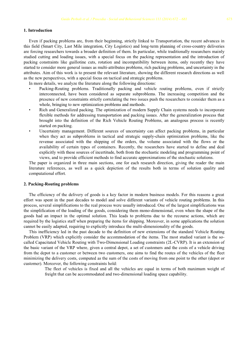 经典包装问题的现在的版本。特别是,很多研究都集中在线上版本的装箱问题,即本包装箱的变体,其中的项目是一个接一个并没有知识(或一个有限的)上的下一个项目的数量是给决策者。特别是,研究人员研究了在不同的箱子里装的物品的方法,结果是他们的绝对或渐近行为。只有在最近几年,研究人员已经开始研究随机版本的包装问题。这些变种的出现主要是在战略和方针问题必须解决,特别是,当一个有计划他的舰队的能力(克莱尼克等人2012B)或随机成本和利润的存在问题(perboli et al.,2012A;2012b)。 perboli等人(2012b)扩展了标准的包装问题,包装问题的多处理器的定义不确定性下的。这是一个新的随机变量的包装问题,在那里,给定一组项目,以数量和随机利润为特点,一组潜在的处理程序,我们希望找到一个子集的项目其中预期利润最大化。该项目的利润是由一个确定的利润加上一个随机利润,由于处理成本的处理程序。与其他随机问题相反文学,随机利润的概率分布是未知的。在本文中,一个两阶段的随机引入递归模型。从理论的角度来看,该文件显示,在一个假设,加载任何项目的最大随机利润的概率分布成为一个极值分布。此外,所装载的物品的总期望利润与总的对数成正比这些项目的可访问性的集合的处理程序,并在最优性,任何项目的处理由一组的处理程序根据多项Logit模型。图表给出了2个实例的结果。实例不同项目,利润类型,随机振荡的幅度,随机分布类型。在细节,列1给出了项目的数量。其余的列显示,为每个测试的分布(均匀和Gumbel)的均值和二级模型的目标函数之间的比例差距的变化递归和确定性Logit逼近。随机性的确定性逼近模型提供了非常有前途的结果可以忽略不计的计算时间,与一个两阶段模型的差距追索权不到2%。从计算时间的角度来看,平均计算时间两阶段随机模型的递归是120秒,而确定的近似需要较少比一秒钟