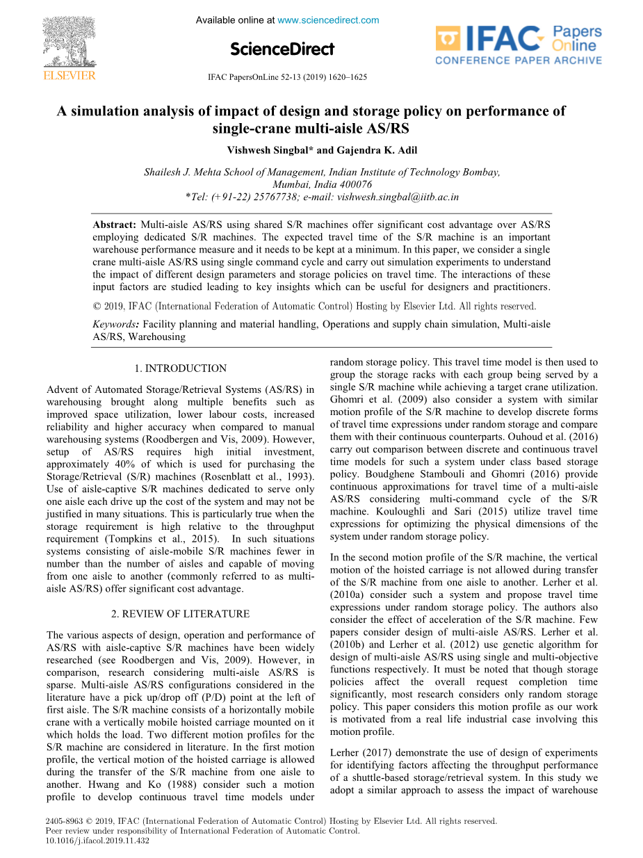 与使用专用S / R机器的AS / RS 相比,使用共享S / R机器的多通道AS / RS具有显著的成本优势。S / R机器的预期行程时间是重要的仓库性能指标,需要将其保持在最低水平。在本文中,我们研究使用单个命令周期的单堆垛机多通道AS / RS,并进行仿真实验以了解不同设计参数和存储策略对行程时间的影响。对这些输入因素的相互作用进行了研究,得出了重要的见解,这些见解对于设计人员和从业人员很有用。