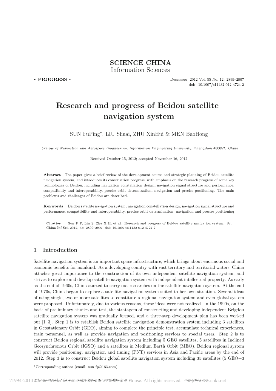 摘要 本文简要回顾北斗卫星导航系统的发展历程和战略规划,介绍了其施工进度,强调了北斗卫星的一些关键技术的研究进展,包括导航星座设计、导航信号的结构和性能, 兼容性和互通性,精确的轨道计算,导航和精确定位。描述了北斗系统面临的主要问题和挑战。