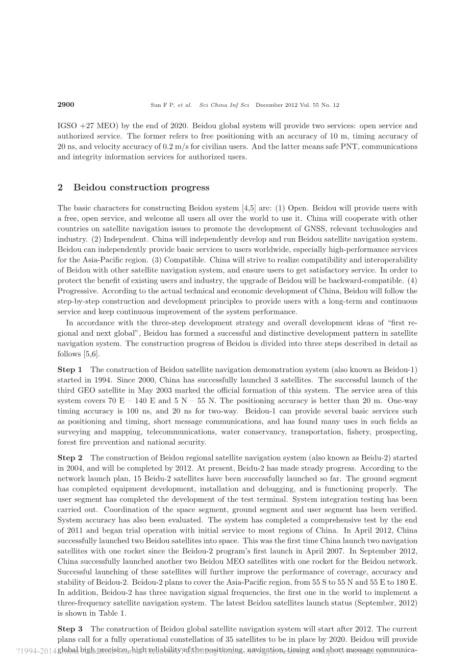 步骤2 北斗区域卫星导航系统建设(也称为Beidu-2),在2004年开始,将在2012年完成。目前,Beidu-2稳步进展。根据网络启动计划,Beidu-2迄今已成功发射了15颗卫星。地面部分已完成设备开发、安装和调试,可以正常使用。用户端已经完成测试终端的发展。系统集成测试已经执行。协调的空间段、地面段和用户段已得到验证。系统精度也被评估。系统已在2011年底完成了全面的测试,并在2011年,开始试运行并为中国的大部分地区提供服务。2012年4月,中国成功发射两颗北斗卫星进入太空。这是自2007年7月北斗-2程序的第一次发射后中国第一次用一个火箭发射两个导航卫星。2012年9月, 中国成功用一颗火箭为北斗网络发射了另外两颗北斗MEO卫星。这些卫星的成功发射将进一步提高北斗导航卫星的覆盖率精度和稳定性。北斗-2计划覆盖亚太地区,从55S到55N,从55E到180E。此外,北斗-2有3个导航信号频率,是世界上第一个实现3种导航频率的卫星导航系统。最新的北斗卫星发射状态(2012年9月) 如表1所示。