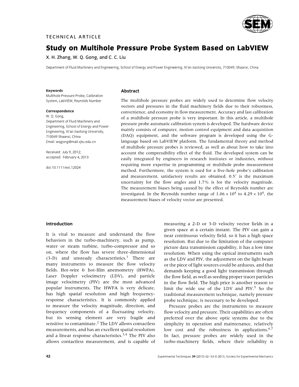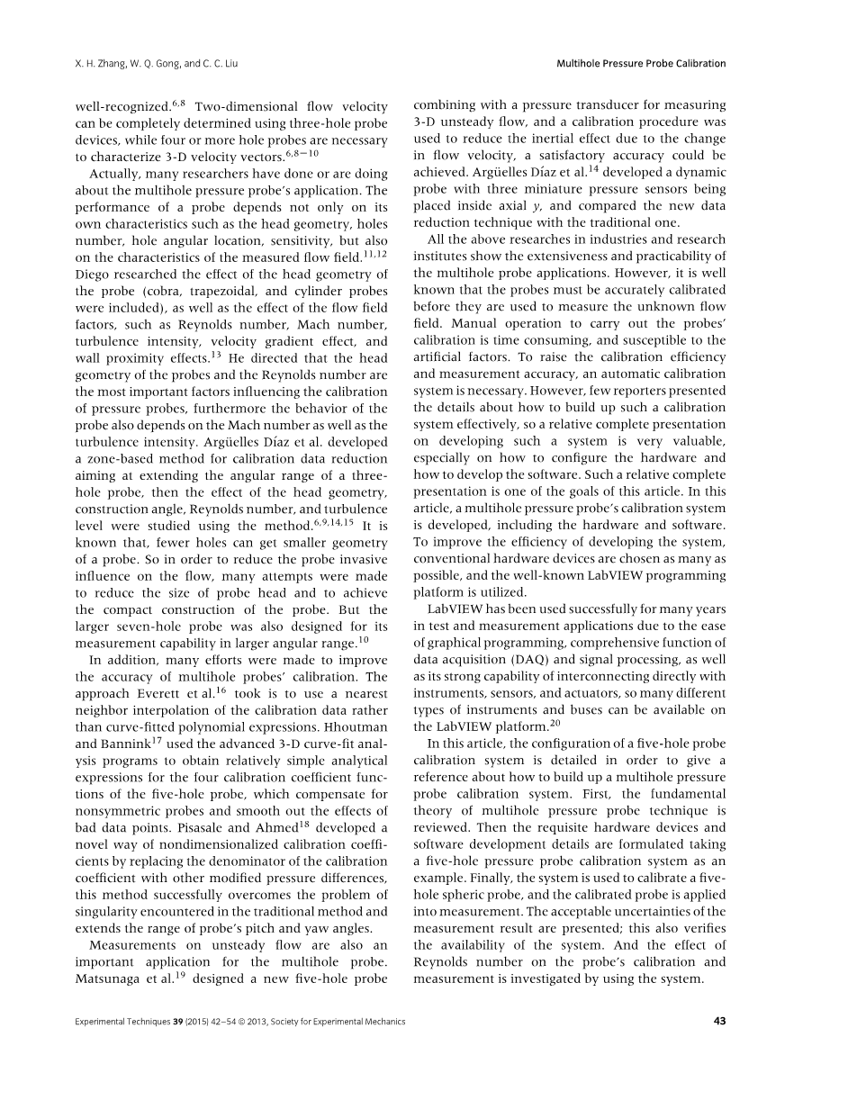 多孔压力探针被广泛用于确定流速向量和压力在流体机械领域,由于它在流量测量方面的鲁棒性,方便性与经济性。精度和快速校准对于多孔压力探针是非常重要的。在这篇文章中,一种多孔压力探针自动校准系统正在被研究。硬件设备主要包括计算机、运动控制设备和数据采集(DAQ)设备和软件程序使用基于LabVIEW平台开发语言。多孔压力探针的基本理论与方法审阅,以及如何进入流体的可压缩性效应。所开发的系统可以很容易被工程师集成在研究机构或各行业中,而不需要更多的编程和多孔压力探针测量方法方面的专业知识。此外,该系统是用于一五孔探针的校准和测量,并且得到了满意的结果。0.5◦是最大的流角和1.7%的不确定性是速度的大小。雷诺兹数效应引起的测量偏差正在调查。在雷诺兹数范围为1.06~104~4.29~104,速度矢量的测量误差正在出现。