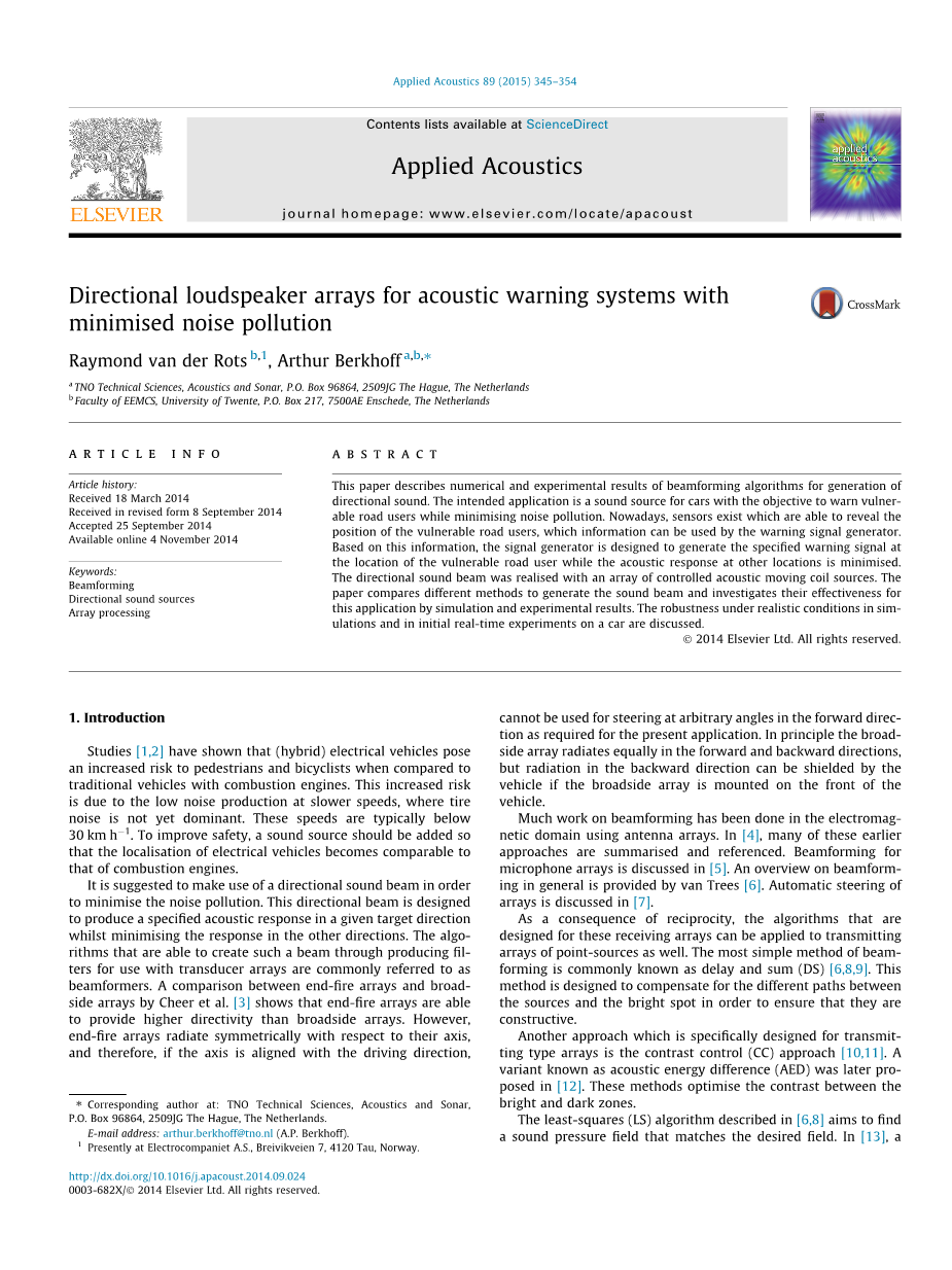 本文介绍了新一代定向声音的波束形成算法数值模拟和实验结果。预期的应用是用于与目标汽车到警告易受伤害的道路使用者,同时尽量减少噪音污染的声源。现在,传感器存在其能够揭示易受伤害的道路使用者,该信息可以通过警告信号发生器可以使用的位置。基于此信息,该信号发生器被设计成产生在易受伤害的道路使用者的位置的指定的警告信号,而在其它位置处的声学响应是最小化.定向声束用受控声动圈式源阵列实现。纸张不同的方法进行比较,以生成声束并调查该应用通过仿真和实验结果的有效性。在模拟中和在汽车上的初始实时实验在现实条件下的稳健性进行了讨论。