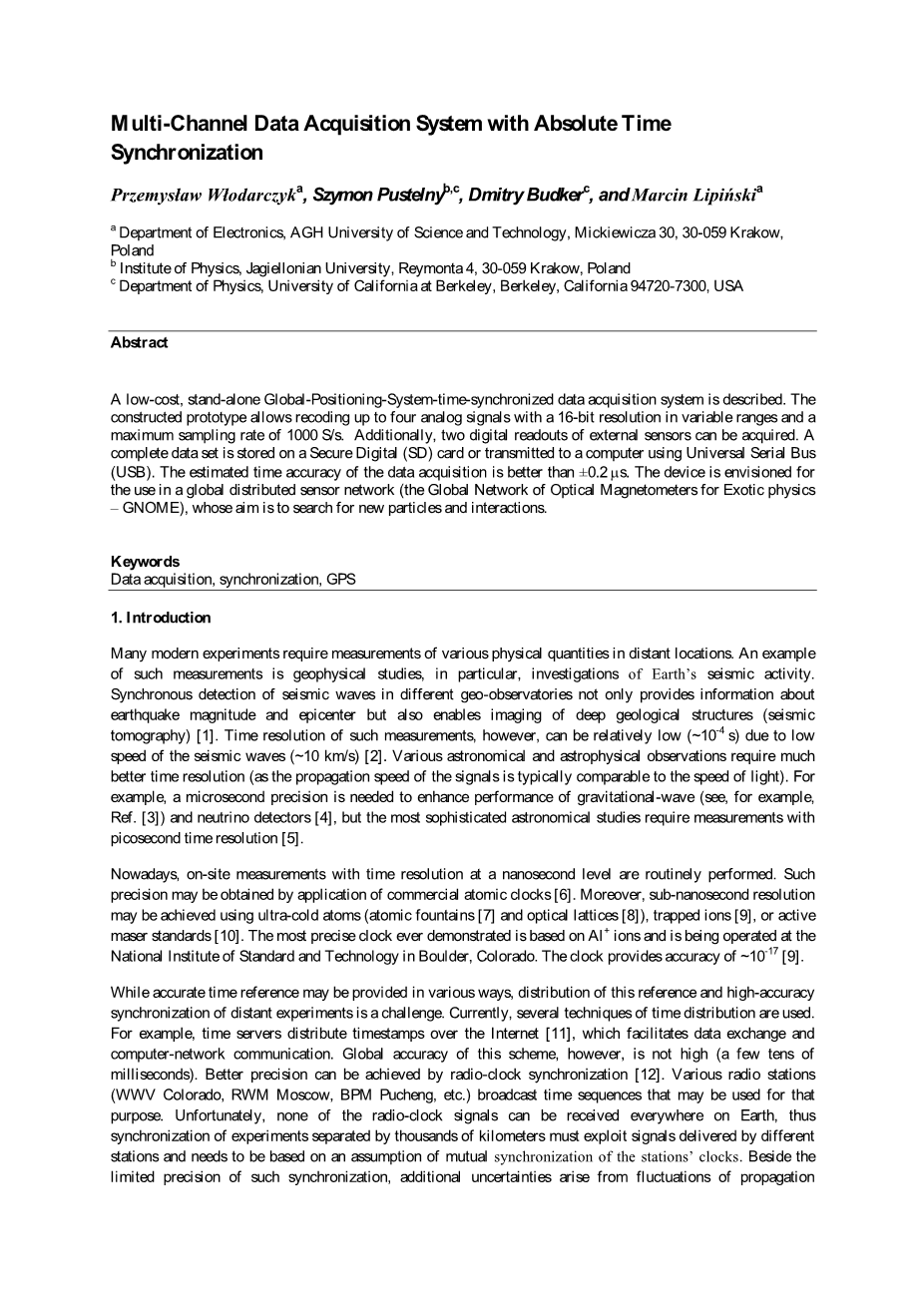 许多现代实验需要在远程地点对各种物理量进行测量。例如这种测量是地球物理研究,特别是地球的地震活动的调查。地震波在不的地理观测站的同步检测不仅提供了有关信息地震的震级和震中,但也使深部的地质构造成像(地震断层摄影)[1]。这种测量的时间分辨率,但是,可以是相对低的(〜10 - 4多个),由于低地震波的速度(〜10公里/秒)[2]。各种天文天体物理和观测需要更好的时间分辨率(作为信号的传播速度通常可比的光的速度)。例如,需要一个微秒精度提高引力波的性能(参见,例如,参考. [3])和中微子探测器[4],但最精密的天文研究需要达到测量皮秒时间分辨率[5]。