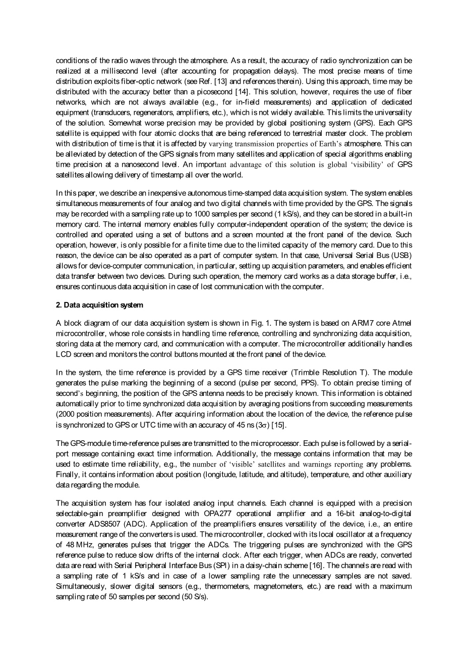 在本文中,我们描述了一种廉价的自主时间标记的数据采集系统。该系统使由全球定位系统提供的四个模拟量和2个数字信道的同时测量。信号可能与采样率高达每秒1000个样本记录(1 kS/s),他们可以存储在内置的存储卡。内部存储器可使系统完全独立运行,该设备是使用一组按钮和一个屏幕安装在设备的前面板的控制和操作。这样的操作,但是,由于有限的存储卡的容量有限时间是可能的。由于这个原因,该装置还可以作为计算机系统的一部分进行操作。在这种情况下,通用串行总线(USB)允许设备的计算机通信,特别是设置采集参数,并使设备间有效率的数据传输。在这样的操作过程中,存储卡作为数据存储缓冲区,即确保连续的数据采集与计算机的通信。