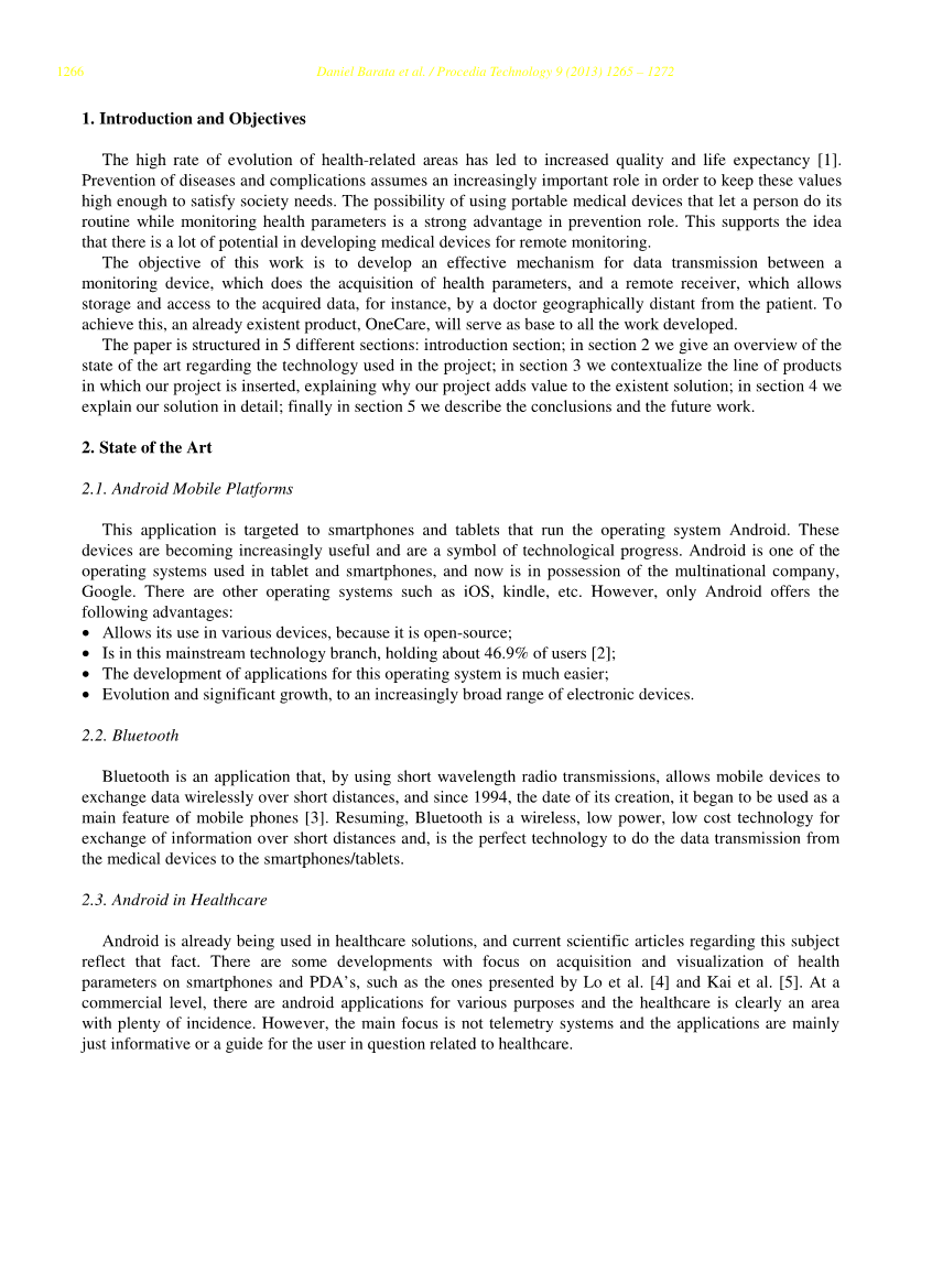 安卓系统已经被用于医疗保健的解决方案中,近期基于该主题的科学文章就反映了这一事实。就像Lo et al.[4]和 Kai et al.[5]等人提出的一样,安卓系统的发展重点在于用智能手机和PDA将健康指标形象化且得到参数。就商业层面来说,安卓系统应用于各种用途,而用于医疗保健的显然是一个常见的应用领域。然而,现在的主要的问题不是应用系统本身,而是该应用系统主要还是给用户提供信息以及在医疗保健方面遇到问题的指南。