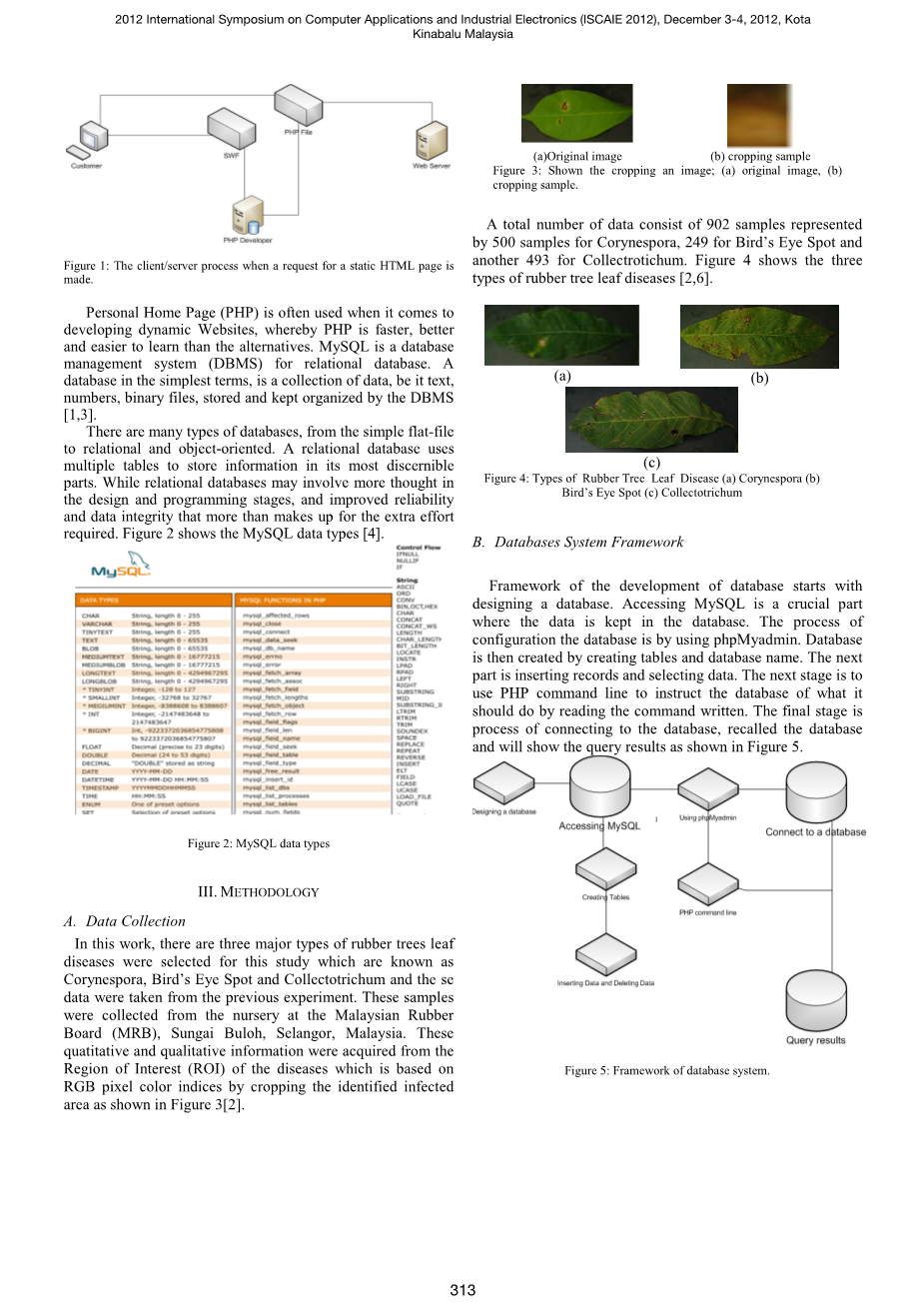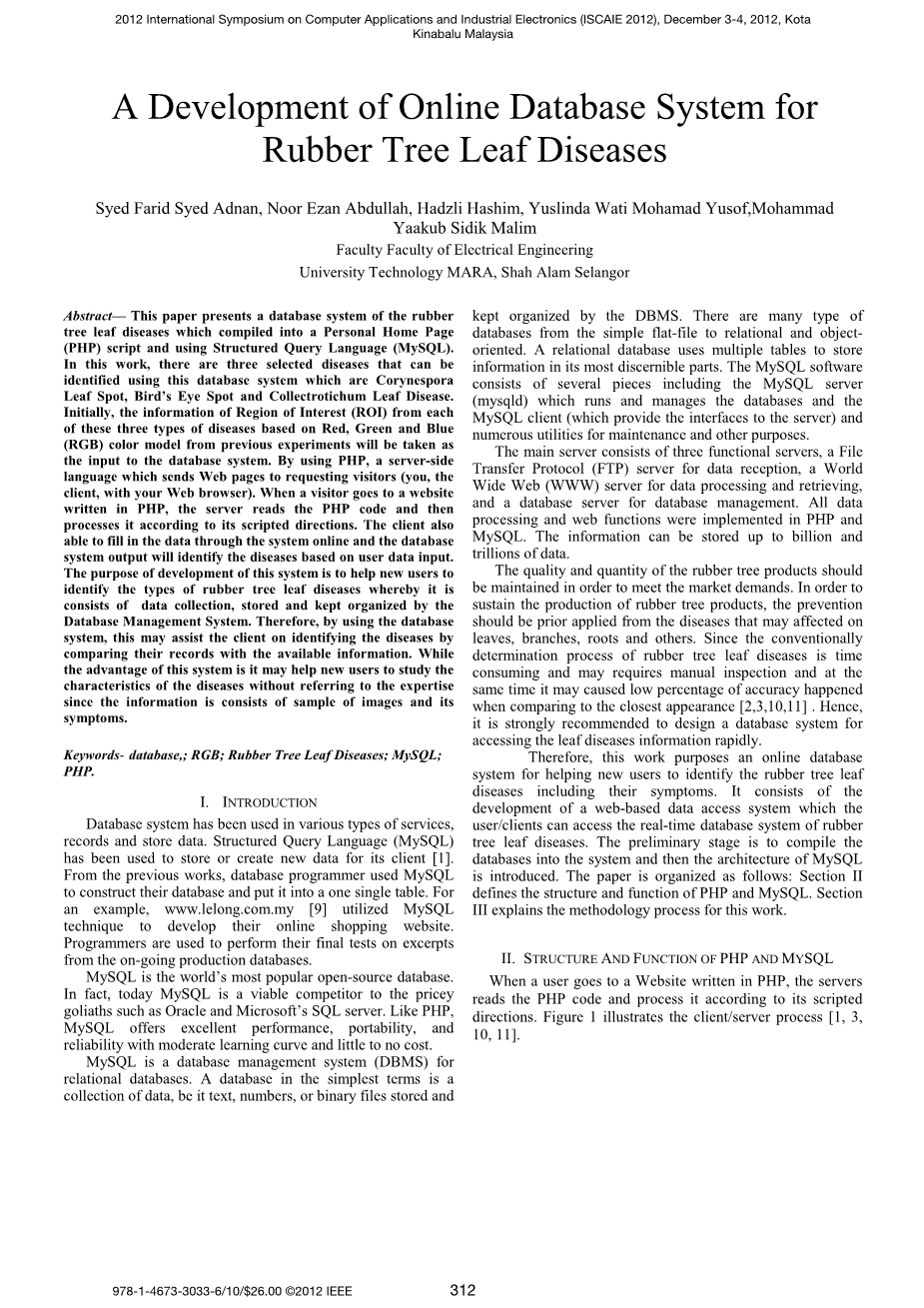 摘要:本文介绍了一种利用结构化查询语言(MySQL)将橡胶树叶片病害数据库系统编译成个人主页(PHP)脚本。在本工作中,利用该数据库系统可识别出三种选定的病害,分别是珊瑚叶斑病、雀斑病和采集性叶病。首先,将之前实验中基于红、绿、蓝(RGB)颜色模型的三种疾病的感兴趣区域(ROI)信息作为数据库系统的输入。通过使用PHP,这是一种服务器端语言,它将Web页面发送给请求的访问者(您、客户机和您的Web浏览器)。当访问者访问用PHP编写的网站时,服务器读取PHP代码,然后根据脚本化的方向处理它。客户端还可以通过系统在线填写数据,数据库系统输出将根据用户输入的数据识别疾病。本系统的开发目的是帮助新用户识别橡胶树叶片病害的类型,通过数据库管理系统对橡胶树叶片病害进行数据采集、存储和整理。因此,通过使用数据库系统,这可以帮助客户通过比较他们的记录和现有信息来识别疾病。而该系统的优点在于,它可以帮助新用户研究疾病的特点,而不需要参考专业知识,因为信息是由图像样本及其症状组成的。