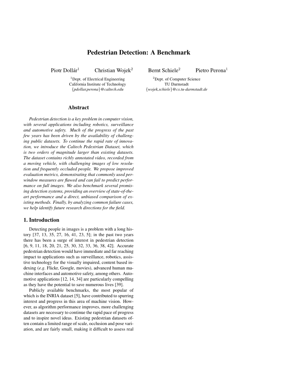 我们介绍了加州理工学院行人数据库并且在第二章节和第三章节介绍了它的统计数据。我们讨论每个窗口度量的缺陷,并根据帕斯卡标准描述我们的评估方法[28]。在第四章节,我们讨论了7种有前景的行人检测方法的详细性能评估。在第五章节总结了我们的发现并且讨论了开放性问题。