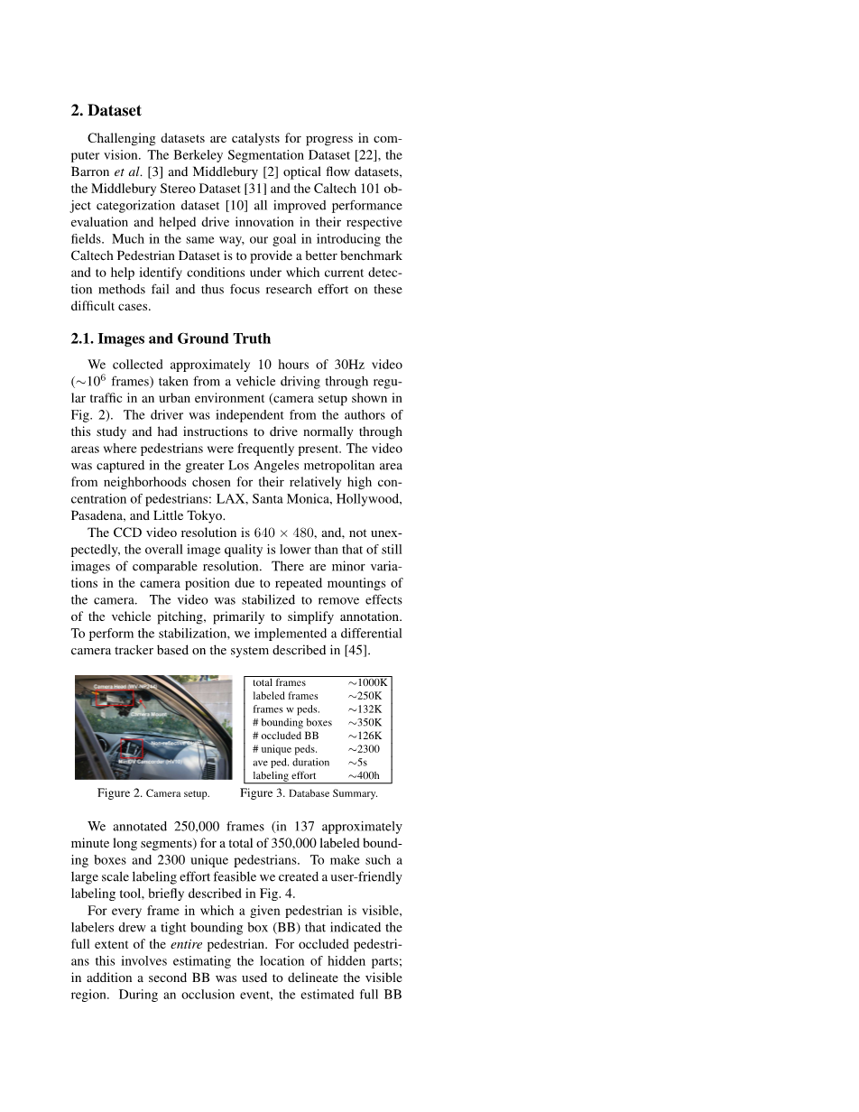 庞大的数据库是计算机视觉进步的催化剂。Berkeley分段数据库[22],Barron[3]和Middlebury[2]视觉数据库、Middlebury立体数据库[31]和Caltech 101对象分类数据库[10]都改进了性能评估,并有助于推动各自领域的创新。同样,我们引入加州理工学院行人数据库的目的是提供更好的基准,帮助确定当前检测方法失败的原因,从而将研究工作集中在这些困难的案例上。