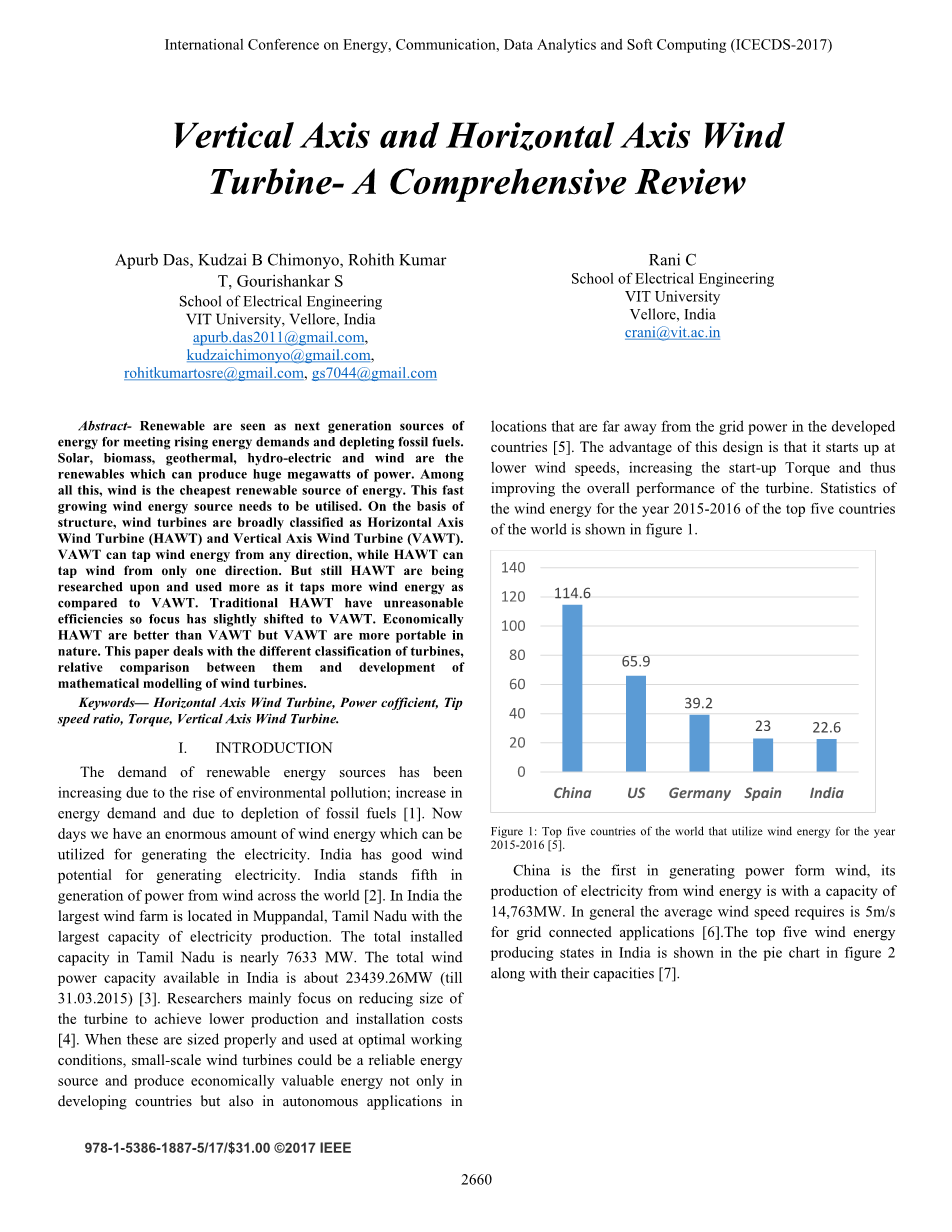 由于环境污染的增加、能源需求的增加和化石燃料的消耗,可再生能源的需求不断增加[1]。现在我们有大量的风能,可以用来发电。印度有很好的风力发电潜力。印度在风力发电方面居世界第五位[2]。在印度,最大的风力发电场位于泰米尔纳德邦的木本达尔,拥有最大的电力生产能力。泰米尔纳德邦的总装机容量接近7633兆瓦。印度可用的总风力发电量约为23439.26MW(截至2015年3月31日)[3]。研究人员主要致力于减小发电机的尺寸,以降低生产和安装成本[4]。当这些风力发电机的尺寸适当并在最佳工作条件下使用时,小型风力发电机不仅可以成为发展中国家的可靠能源,而且可以在远离发达国家电网的地方自主应用,产生具有经济价值的能源[5]。这种设计的优点是,它在较低的风速下启动,增加启动扭矩,从而提高发电机的整体性能。世界前五大国家2015-2016年风能统计如图1所示。
