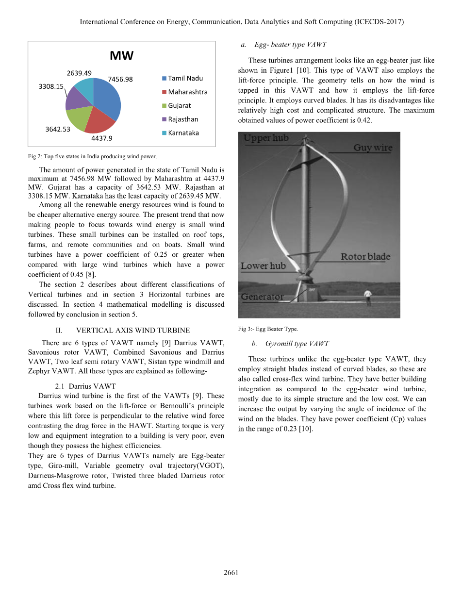 中国是世界上第一个以风能发电的国家,风能发电量为14763MW。一般来说,并网应用所需的平均风速为5米/秒[6]。图2的饼图显示了印度五大风能生产国及其产能[7]。