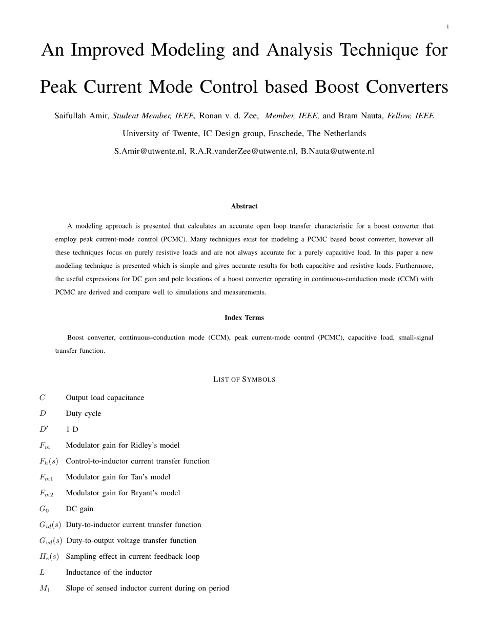 升压转换器,连续导通模式(CCM),峰值电流模式控制(PCMC),容性负载,小信号传递函数。