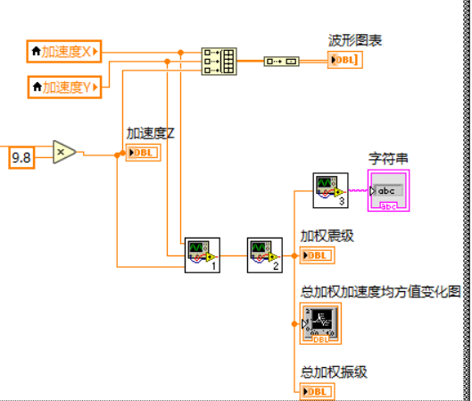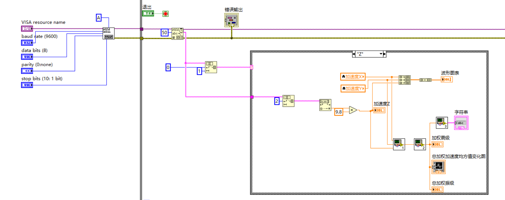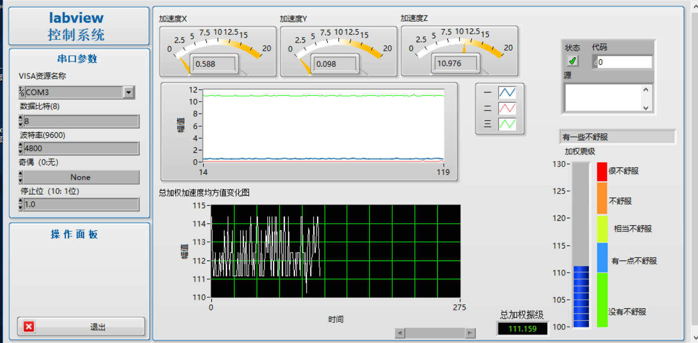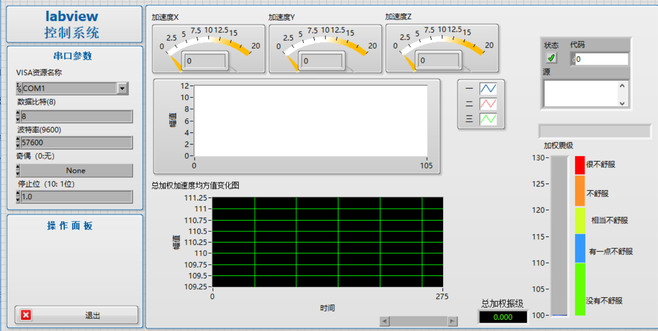 3.根据汽车乘坐舒适度的评价方法,应用Labview编写相应的上位机来对串口发送来的加速度数据进行读取以及数据处理,得到汽车乘坐舒适度的加权加速度以及加权振级,和理论值进行对比并对汽车行驶过程中乘坐的舒适度进行评价,对汽车行驶的过程中舒适度进行实时检测。