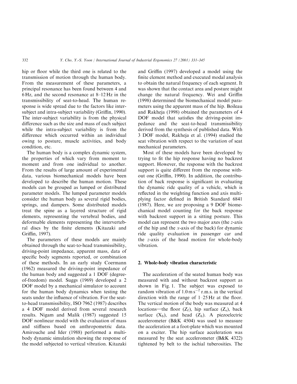 通过座椅到头部的透射率,驱动点阻抗,视在质量,报告的特定身体部位数据或这些方法的组合获得。在早期的研究中,Coermann(1962)测量了人体的驱动点阻抗,并提出了1 DOF(自由度)模型。Suggs(1969)通过机械模拟器开发了一个2自由度模型,以解释在振动影响下测试座椅时人体的动力学。对于座椅到头部的可传递性,ISO 7962(1987)描述了一种来自多个研究结果的4自由度模型。Nigam和Malik(1987)提出了15自由度非线性模型,并基于人体测量数据对质量和刚度进行了评估。Amirouche和Ider(1988)进行了多体动力学仿真,显示了模型在垂直振动下的响应。Kitazaki和Griffin(1997)使用有限元方法开发了一个模型,并进行了模态分析以获得每个分段的固有频率。结果表明,接触面积和姿势可能会改变固有频率。Wei和Griffin(1998)使用髋关节的表观质量确定了生物力学模型参数。Boileau和Rakheja(1998)获得了4 DOF模型的参数,该模型满足了从已发布数据的综合中得出的驱动点阻抗和座椅到头部的可透过性。与3自由度模型,Rakheja等。(1994)研究了座椅振动与座椅机械参数变化的关系。