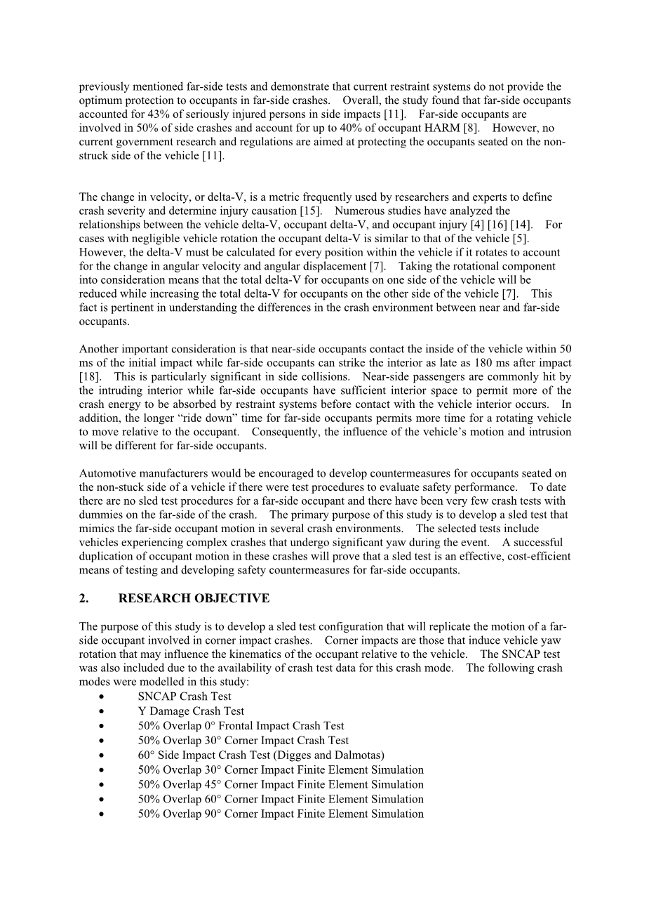 本次研究的目的是开发一个滑行实验结构,以重现远侧乘员在斜角碰撞事故中的运动。斜角碰撞是那些能引发影响乘员相对于车辆运动的旋转的碰撞。由于这种碰撞模式的测试数据难以获得,SNCAP测试也被包括进来。下面的碰撞方式是在本次研究中被模拟的。