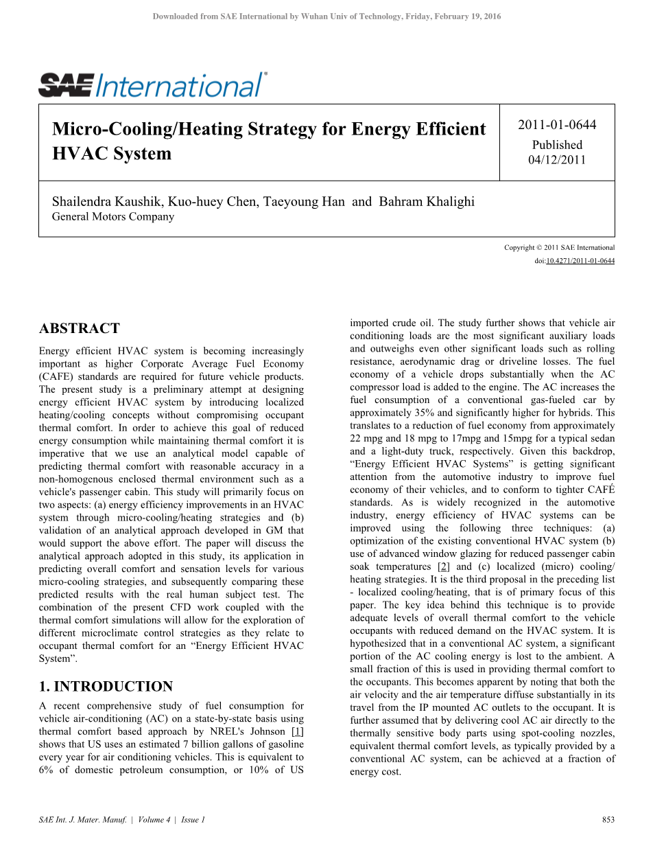 因为未来汽车产品更高的平均燃油经济性标准,节能空调系统正变得越来越重要。目前的研究是节能空调系统在局部加热/冷却而不影响乘客的热舒适性的初步尝试。为了达到减小能量消耗的同时增强热舒适性的目的,我们使用一个在非均匀的封闭热环境中例如汽车客舱,能够准确合理预测热舒适性的解析模型。本研究将主要着重于两个方面:(a)通过空调系统中微型冷却/加热装置来提高能源效率(b)在美国通用公司验证的分析方法将支持上述观点。本文将讨论在这个研究中所采用的分析方法,它应用于预测多种微型冷却战略的全面的舒适感觉水平,随后将这些预测结果与真人测试进行比较。当前CFD技术与热舒适性仿真相结合,探索不同微型气候的控制战略称之为“节能空调系统”。