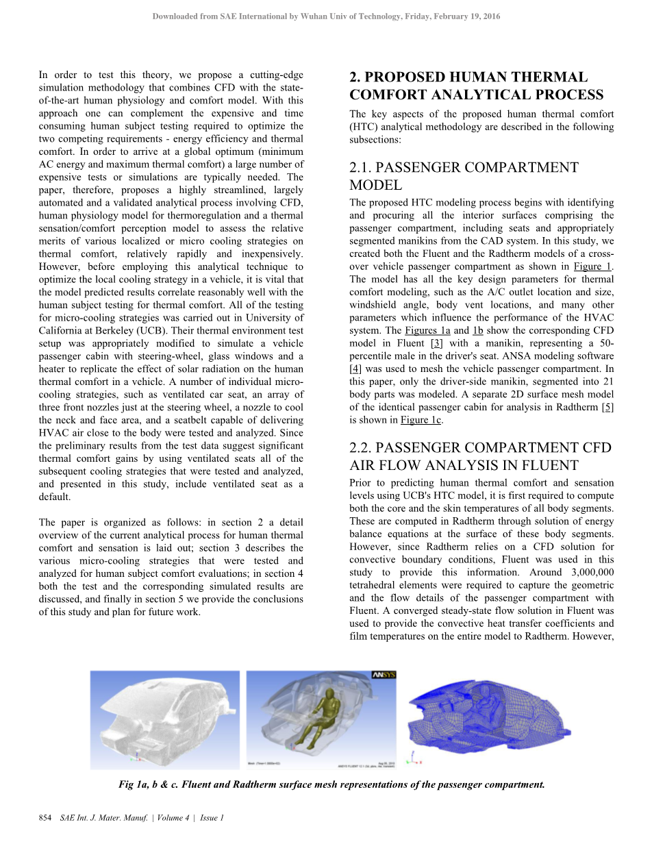 为了测试这个理论,我们提出一个尖端仿真的方法,结合了CFD与最先进的人体模型。运用这个可以,可以弥补人体测试昂贵的费用以及消耗的时间来最大优化能量效率和热舒适性这两个相互矛盾的需求。为了达到全局最优(最小空调能量和最大热舒适性),需要大量昂贵的测试和模拟。因此,本文提供了一个高度简化,高度自动化的分析过程,涉及CFD,用来温度调节的人体生理学模型和一个热感/舒适性的感知模型来评估各种局部或微型冷却方法在热舒适性的优点。然后,在采用这种分析技术来在车上优化局部制冷方法之前,用模型来合理预测人体热舒适测试的结果是至关重要的。所有的微型制冷技术的测试在加州大学伯克利分校(UCB)进行。他们的热环境测试设置被适当修改来模拟一个包括方向盘、玻璃车窗和一个复制太阳辐射效果的加热器的汽车乘客舱。若干个单体微型冷却装置被测试分析,如通风的汽车座椅,3个方向盘前方的排气口来冷却脖子和脸部区域,一个能够暖通空气与人体更接近的座位管道。所有的制冷装置被测试分析包括错误的通风口,同时呈现在研究中,测试数据的初步结果显示显著的热舒适性收益。