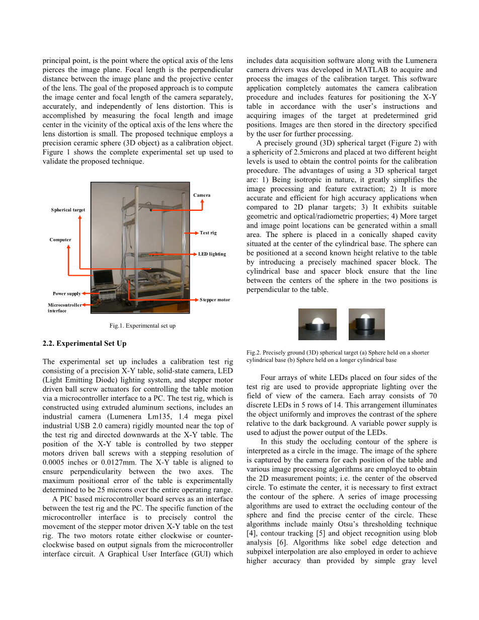 从成像的观点来看,图像中心和焦距无可争议地可以说是两个最重要的相机固有参数。图像中心,也被称为主点,是镜头的光轴穿过像平面的交点。焦距是指像平面和镜头的投影中心之间的垂直距离。所研究方法的目的是分别精确地在忽略透镜畸变的情况下计算图像中心和焦距。这是通过在镜头光轴附近的地方测量焦距和图像中心来完成的,因为镜头光轴附近的畸变很小。该技术采用精密陶瓷球体(3D物体)作为校准的对象。图1展示了用来验证该方法的完整实验设备。