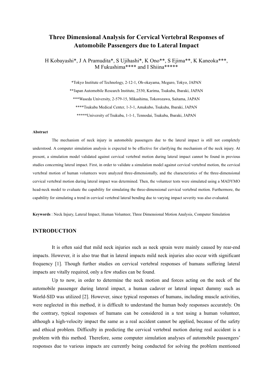 目前为止,已有人体尸体及侧向冲击测试人偶如World-SID被使用,用以证明侧向冲击时汽车乘客颈部运动及受力情况[2]。然而,由于包括肌肉活动在内的人体典型反应在这种方法中是被忽略的,因此很难精准的了解人体反应。相反,人体典型反应在使用人类志愿者测试可以被考虑,由于安全及伦理问题,像真实事故一样的高速冲击试验无法使用人体志愿者。这种方法有一个问题就是很难预测真实事故中的颈椎运动。因此,最近有一些关于对各种冲击下汽车乘客反应的计算机模拟仿真被用来解决上述各种问题。由于模型的准确性对仿真结果影响很大,试图开发一种可以准确模拟部分尸体或人类志愿者测试的模型。最近,一项MADYMO头颈部模型在侧向冲击下的仿真结果仅证明了尸体和志愿者的头部运动[3]。目前没有任何证明侧向冲击下人体颈椎运动的模型的研究被实施。因此,为评估预测真实事故中颈椎运动的准确性,用以证明人类志愿者颈椎运动的头颈部模型是必要的。