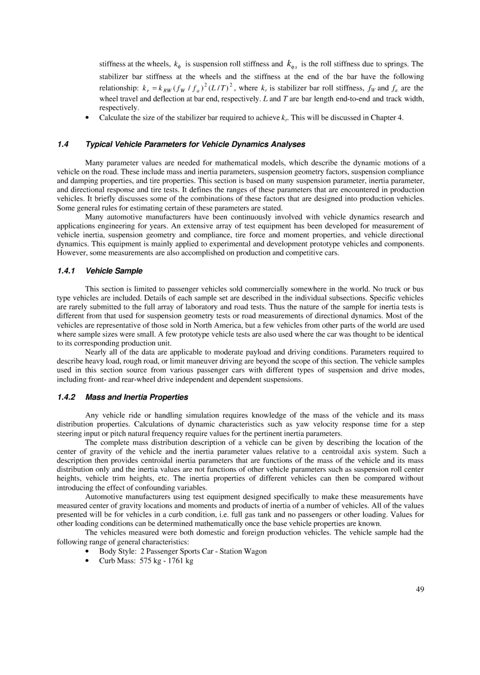 车辆的侧倾转动惯量出现在定向运动控制方程中,这些数值通常只属于簧载质量。在大多数实例中,簧下质量可认为与地球赤道面保持平行,簧载质量侧倾与之相关。图1.4.2-6绘制了若干车型基于簧载质量重心坐标系的簧载质量侧倾转动惯量与整车质量间的关系,其线性近似关系式为,式中为簧载质量重心坐标系上的簧载质量侧倾转动惯量。在一些实例中,采用的是整车侧倾转动惯量(如图1.4.2-7),其线性近似表达式为,式中为整车质心坐标系上的整车侧倾转动惯量。
