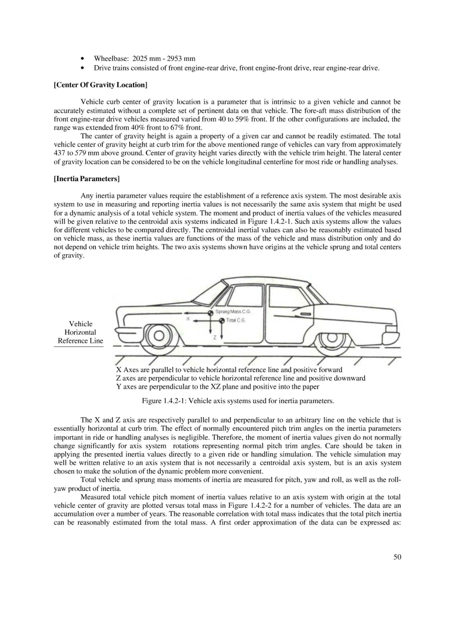 图1.4.2-2所示为若干车型在以整车重心位置为原点的坐标系中所测得的整车俯仰转动惯量的值与汽车总质量间的关系,该数据基于多年的整理,两者间的合理关系显示出总俯仰惯量角可由总质量合理估算得到。数据的一次近似解可表示为:,式中为整车相对于其惯性坐标系的俯仰转动惯量,为整车质量。