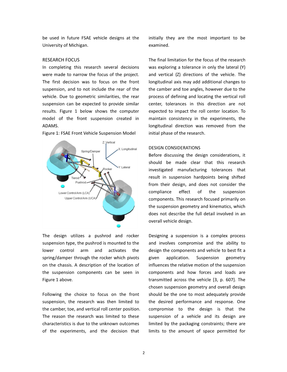 本研究的关键问题是理解制造公差将如何影响FSAE赛车辆悬架性能的。这样的车的设计过程是利用开发设计目标去构建车辆,以反映这些目标。据悉,悬架的设计是一个重要方面,控制车辆的稳定性和驾驶。当微小的变化影响悬架硬点,对悬架特性的影响就会被放大,就可能提供不到理想的性能。因此,汽车的制造公差可能会导致这些微小的变化。本研究的动机不仅是探究公差的影响的知识,也为了拥有能更好地理解通过改变悬架硬点调去控制调整车辆的能力。这个悬架的研究使用的设计实验的优化设计方法在车辆动力学领域并不新鲜,在全世界是一个相对标准的做法。事实上在2000年,Motoyama、Yamanaka和Hoshino进行了利用ADAMS软件研究汽车悬挂系统优化的实验[1]。这份报告的目标是向特定的FSAE车辆的前悬挂。这些评估外倾角,前束角、和侧倾中心位置给定一组公差,和现在有关的结论用于未来FSAE密歇根大学汽车设计。