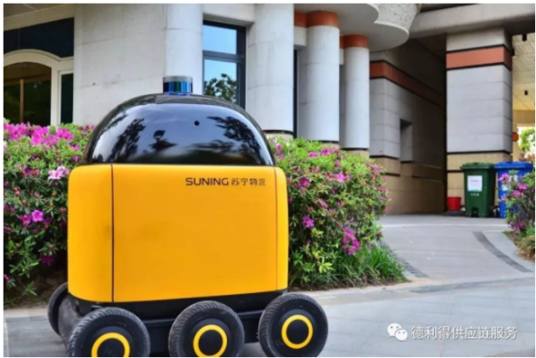 我国电商的崛起一定程度上促进了AGV的发展,每到双十一等购物节,都是对物流行业的巨大挑战,各大电商先后建立了无人仓,以缓解货物运输的压力无人仓中的无人物流车的研发也是各大电商所关注的热点。2018年5月,阿里菜鸟与速腾聚创联合发布了全球首款固态激光雷达的无人物流车G Plus,该车搭载的固态激光雷达的型号为RS-LiDAR-M1Pre,共三台。这款激光雷达的性能十分强大,对障碍物的识别和感知十分精确,所以说它能在一些比较复杂的工作环境下工作。2016年9月,京东的首辆无人配送小车开始试运行,能够在一些小区或学校进行物流包裹的配送。苏宁的“卧龙一号”采用了融合激光雷达技术,定位精度也十分之高,3D感知功能也十分完善[7]。如图1.2分别为菜鸟的G Plus和苏宁的卧龙一号。